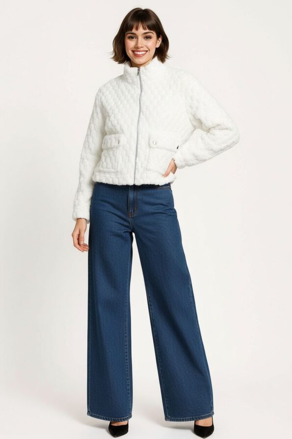 Chaqueta de cuello alto con cierre frontal metálico, confeccionada en tejido suave con efecto acolchado que aporta abrigo y textura, diseño con bolsas funcionales al frente que ofrecen practicidad y detalle moderno, ajuste en cintura que favorece la silueta, acabados limpios que realzan su confección de calidad y garantizan confort durante el uso diario