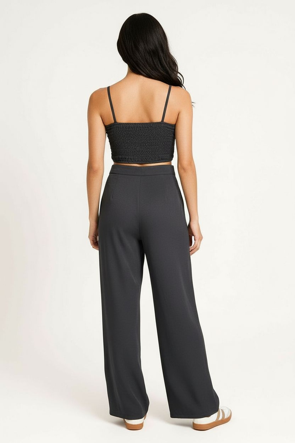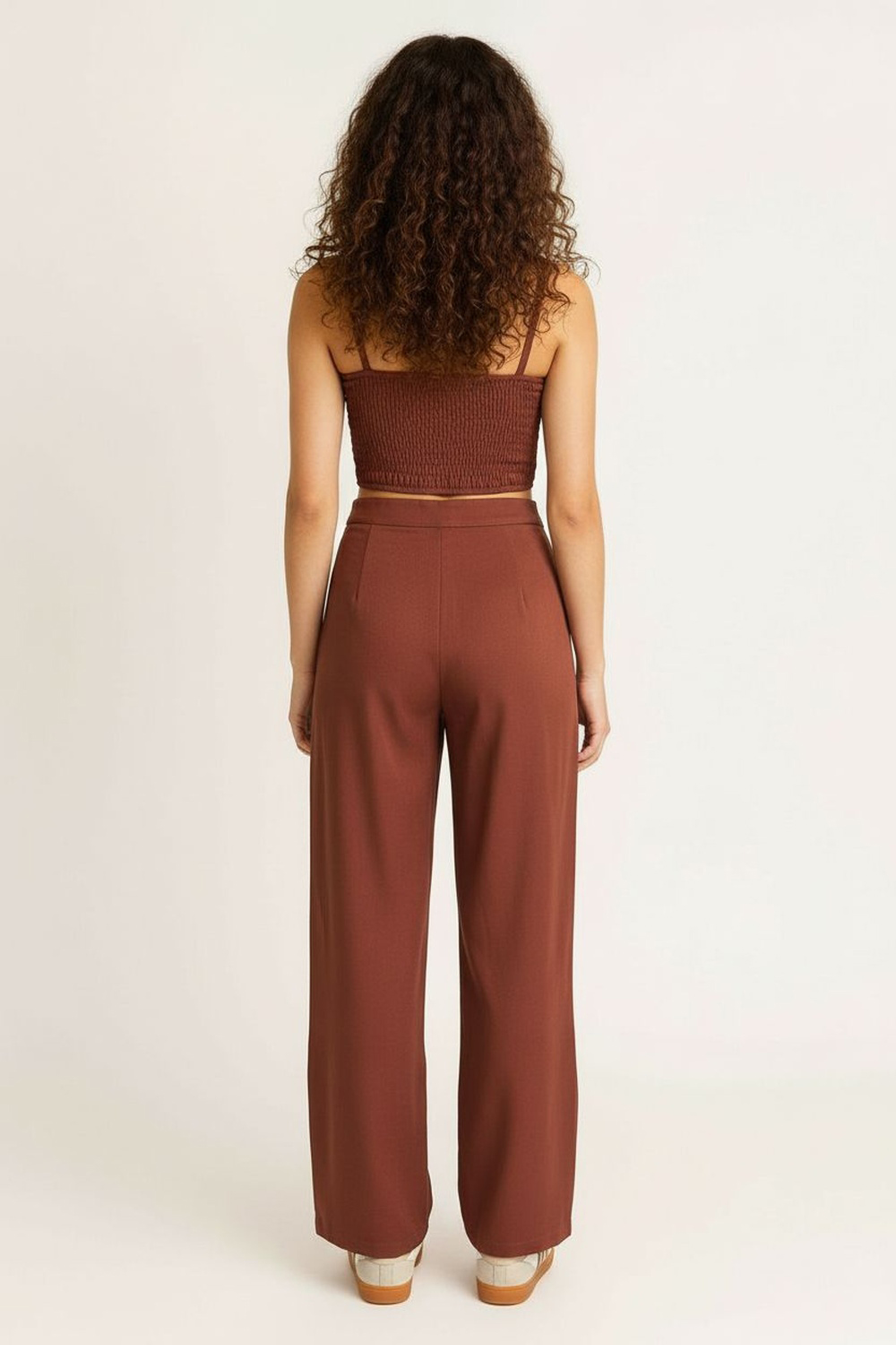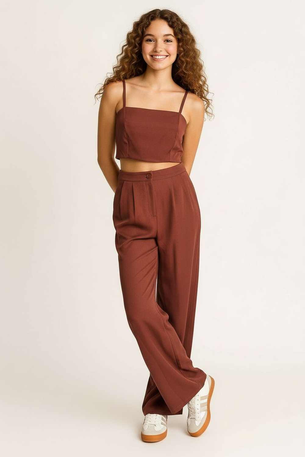 Conjunto integrado por top de tirantes con estructura definida en busto que ofrece soporte cómodo, costuras marcadas que acentúan la forma, cierre posterior discreto que mejora el ajuste, acompañado de pantalón de tiro alto con pinzas frontales que aportan caída limpia, pretina ancha que brinda seguridad al portar, pernera recta que aporta movimiento natural, tela con ligera elasticidad que mejora la libertad al caminar