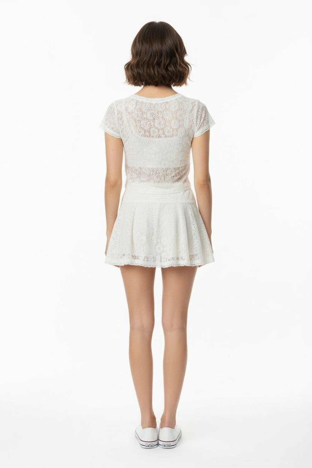 Conjunto de blusa de manga corta con escote y amarre frontal, corte recto, minifalda con pretina y caída ligera, estructura suave y ajuste cómodo
