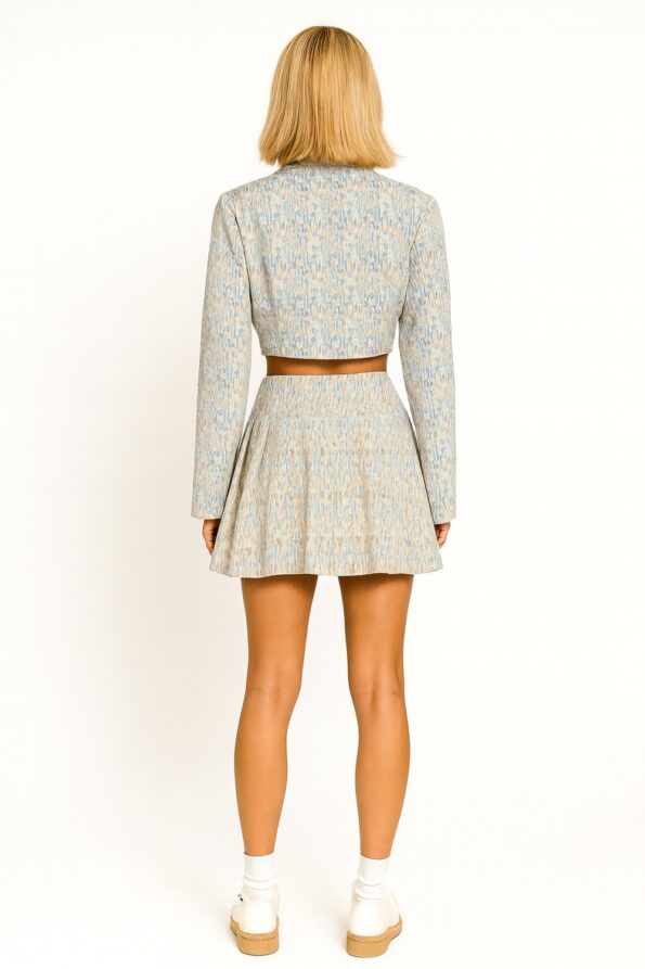 Conjunto bouclé compuesto por saco corto de manga larga con solapa amplia que aporta un estilo sofisticado y moderno, cierre frontal con botones que realza su diseño estructurado, falda corta de corte tableado que brinda movimiento y frescura, confección en tela bouclé de textura suave que asegura comodidad y resistencia, ideal para un look coordinado y versátil