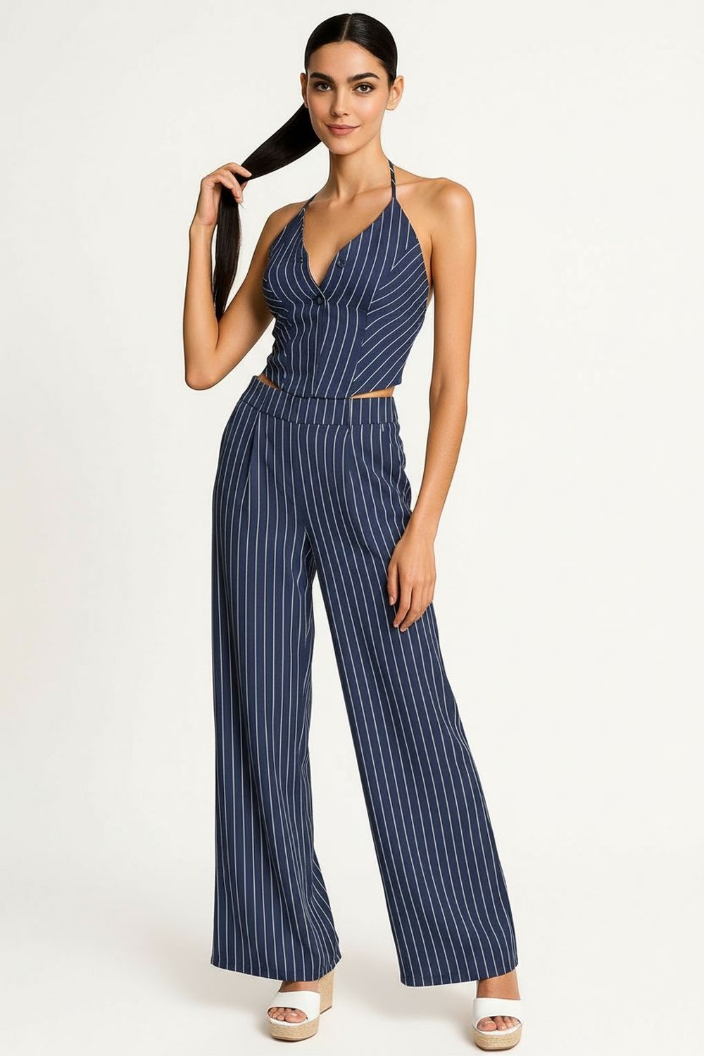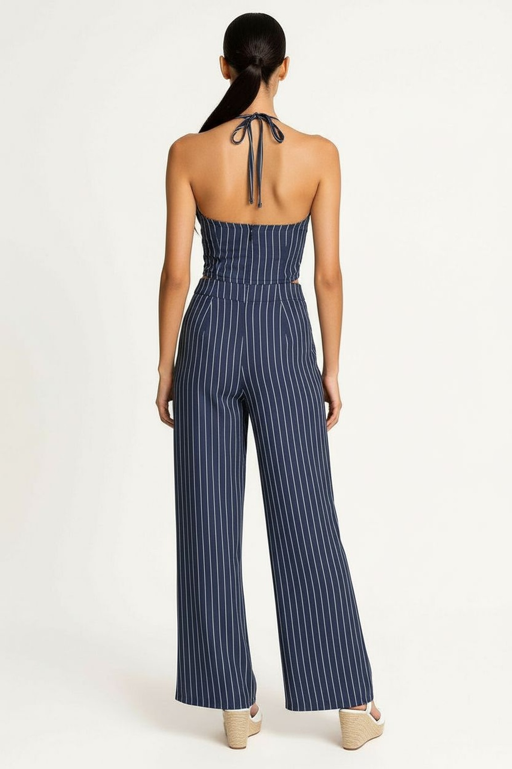 Conjunto de chaleco con escote halter, botonadura frontal, ajuste al torso, espalda descubierta, pantalón de tiro medio, pierna amplia, caída recta