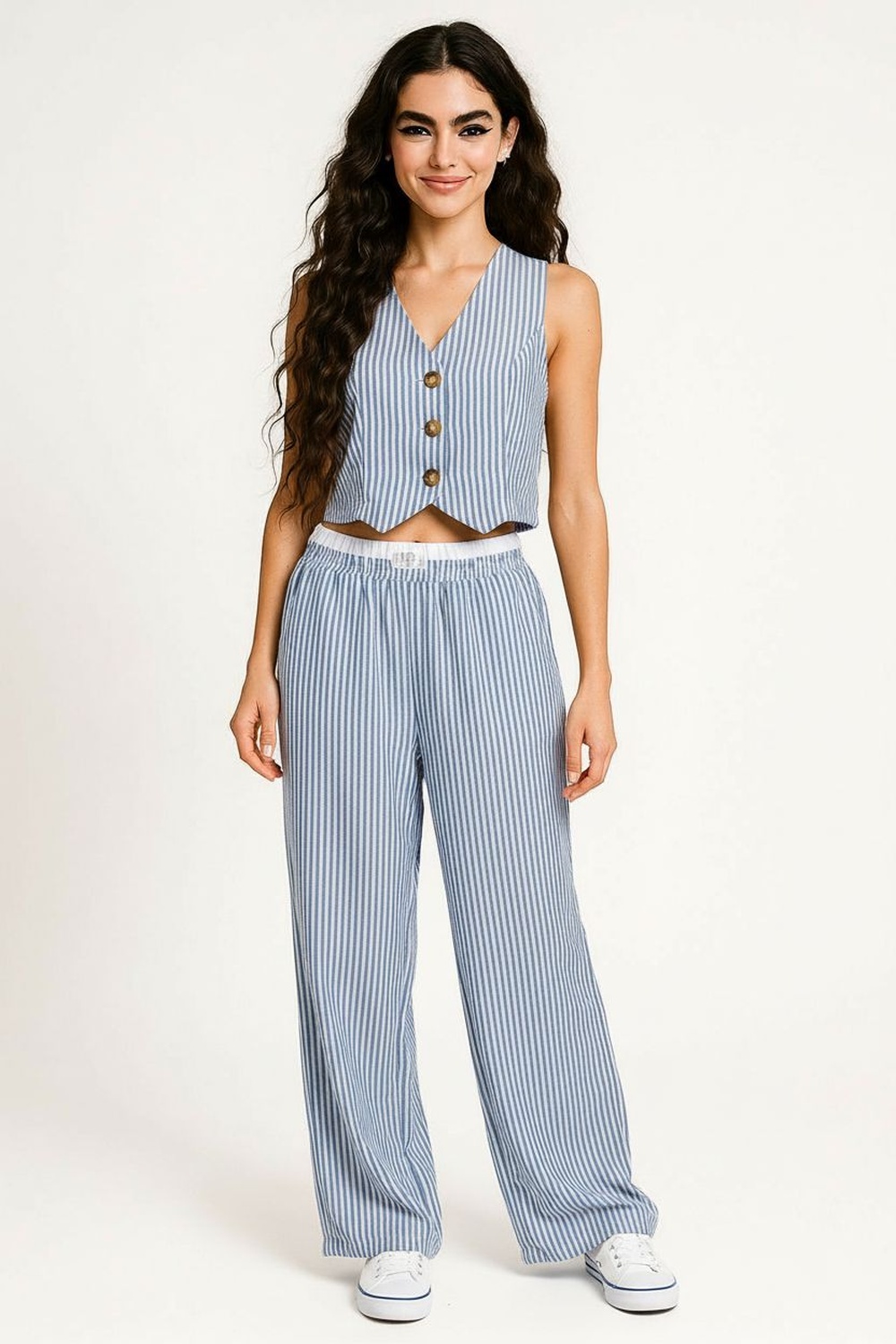 Conjunto con chaleco de escote en V y botonadura frontal, corte corto que marca la cintura, acabado estructurado con ajuste favorecedor en torso, pantalón de tiro medio con pretina elástica y pierna amplia de caída recta que brinda comodidad y movimiento, confección ligera de textura suave al tacto