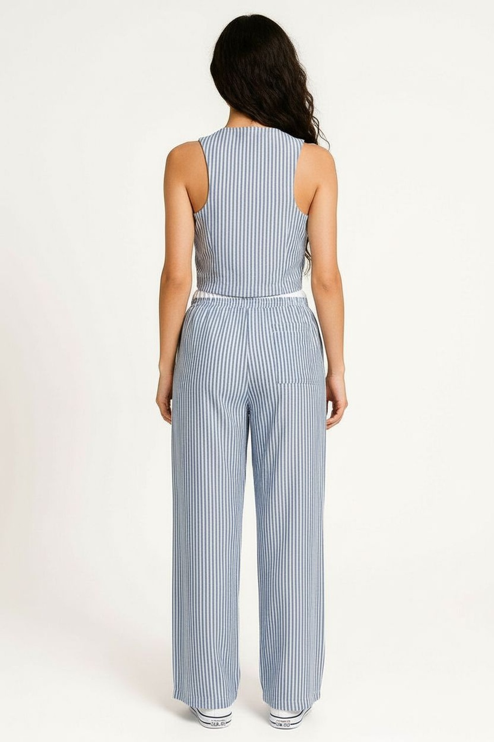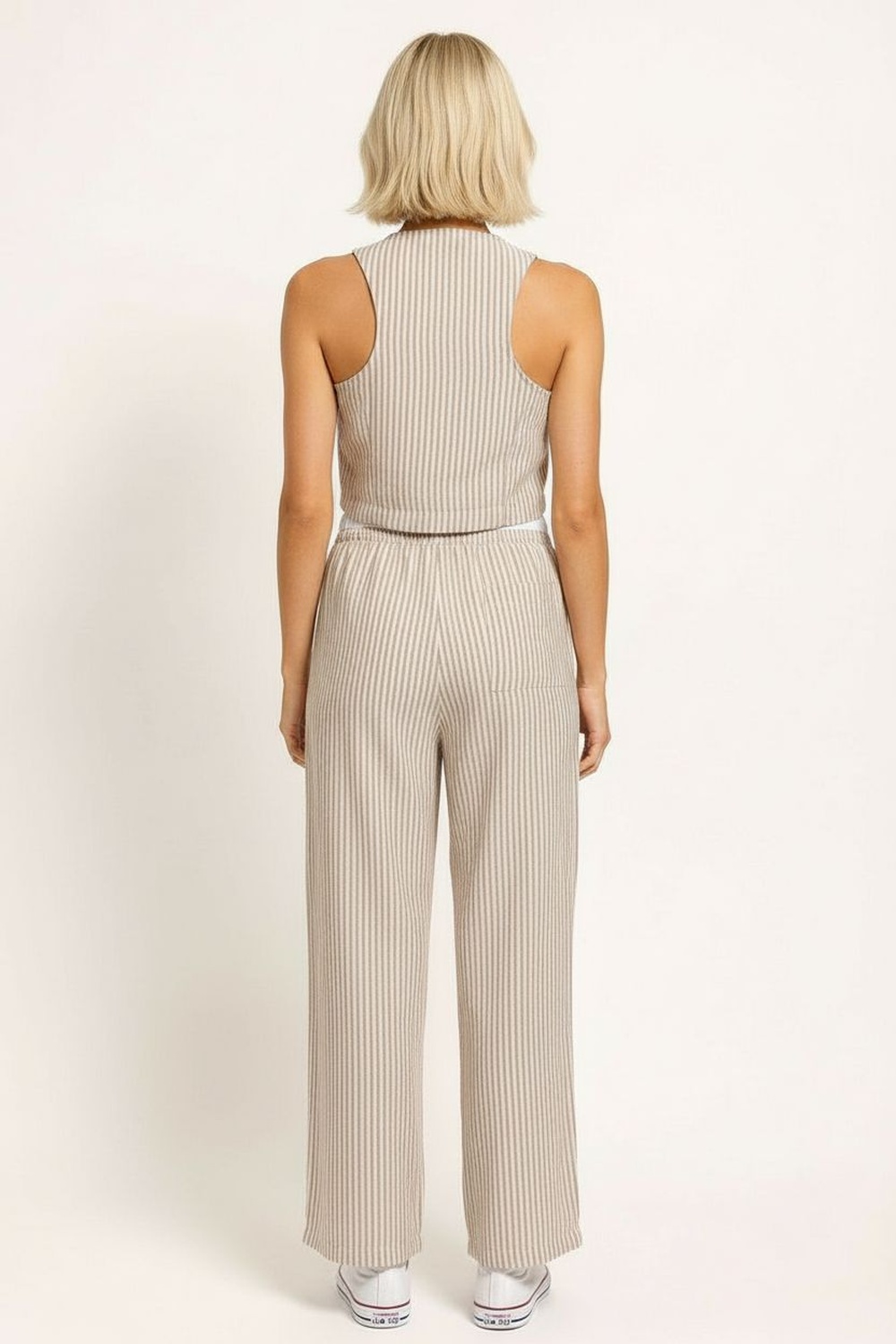 Conjunto de crepón con top sin mangas de escote en V y jareta frontal ajustable, corte ligeramente entallado que estiliza la parte superior, pantalón de tiro medio con pretina cómoda y pierna recta de caída amplia, textura ligera con acabado arrugado que aporta frescura y versatilidad