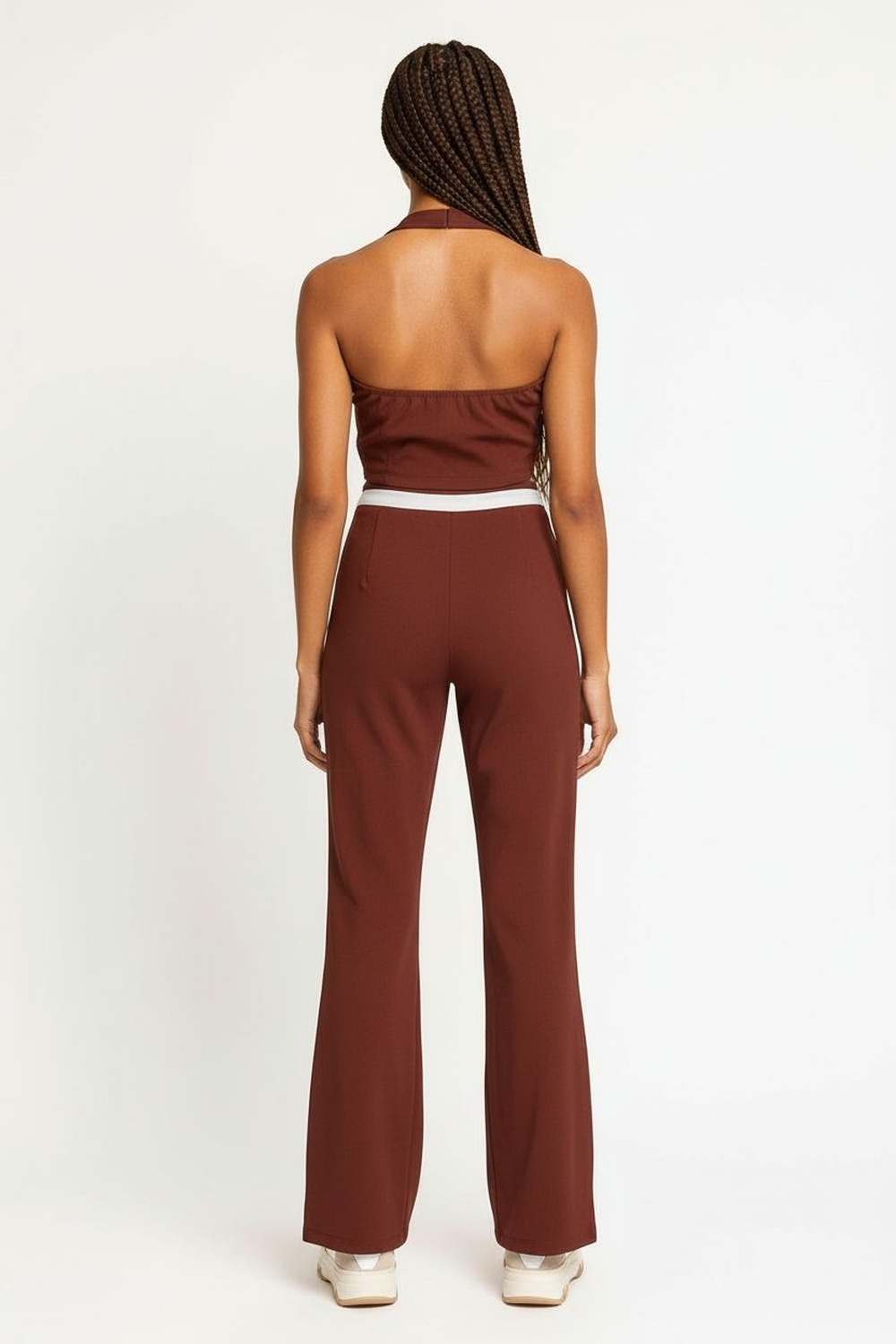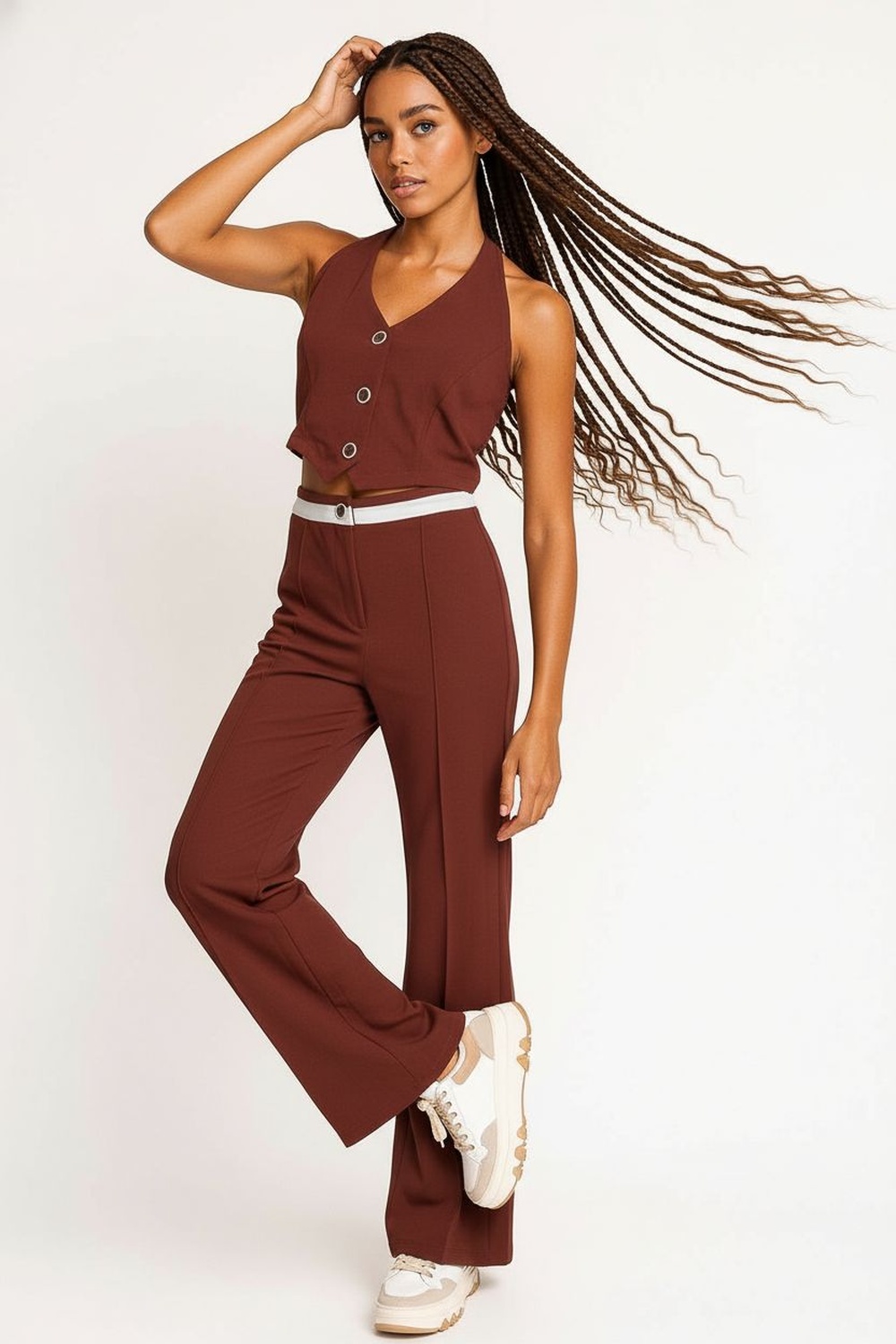 Conjunto compuesto por chaleco escotado con cierre de botones frontales y ajuste entallado que resalta la silueta, pantalón de corte amplio con pretina suave que brinda comodidad durante el movimiento, confección en tela fluida que aporta caída elegante y ligereza, acabado limpio que ofrece una apariencia moderna y sofisticada para distintas ocasiones