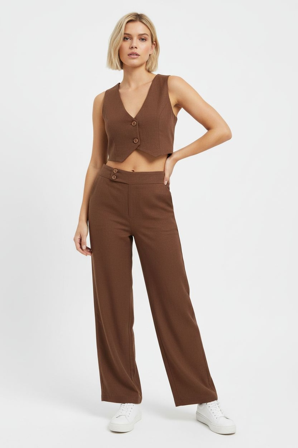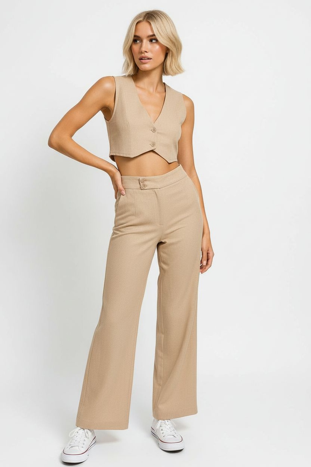 Conjunto de chaleco sin mangas con escote en V profundo y botonadura frontal funcional, pantalón de tiro medio con pierna recta y largo al tobillo, confección en tejido tipo lino que aporta frescura, ambas piezas con estructura definida y ajuste cómodo