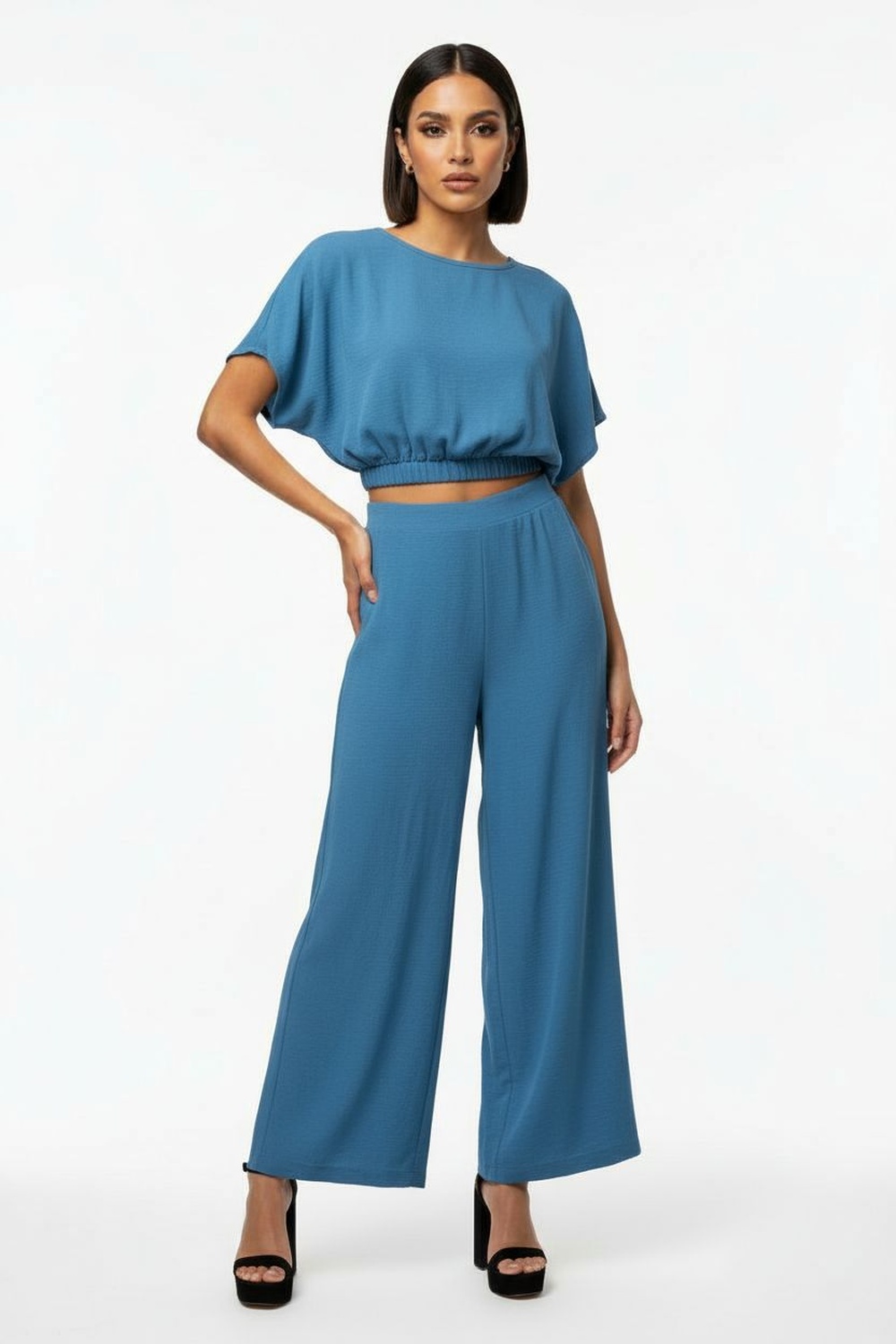 Conjunto de dos piezas, top de tirantes con corte recto y caída ligera, pantalón de tiro alto con pierna amplia, pretina cómoda con ajuste