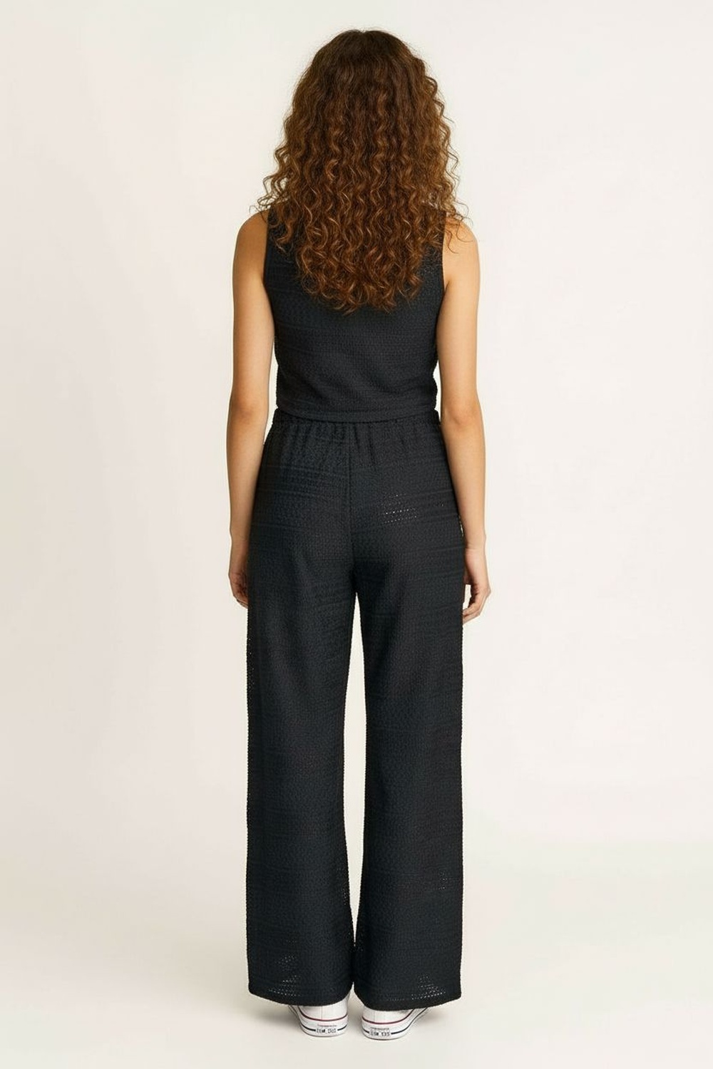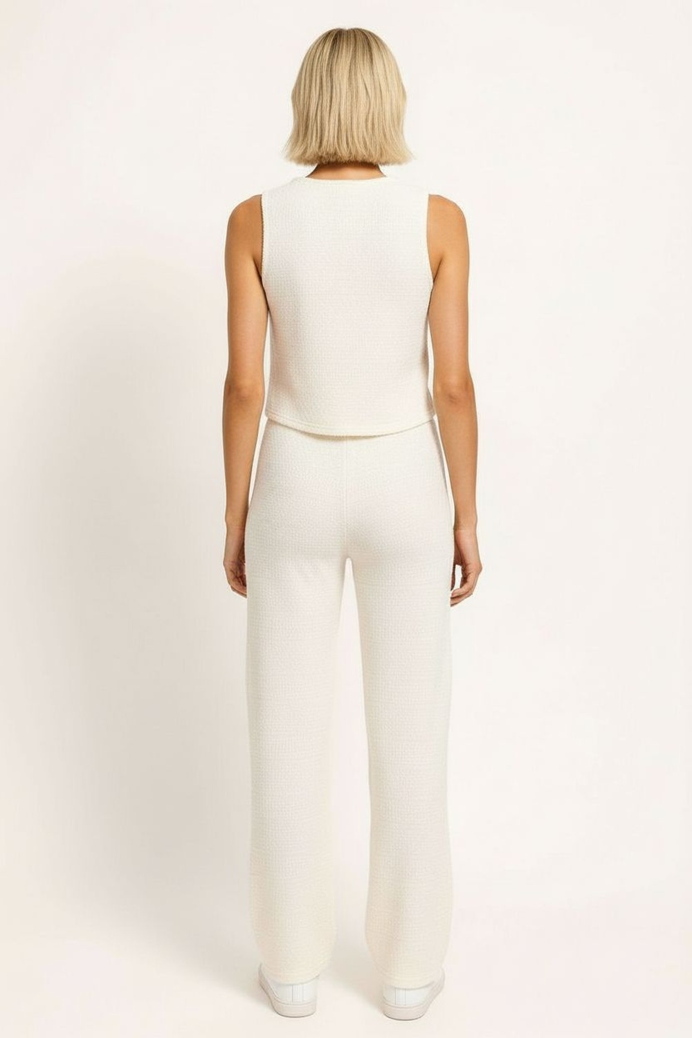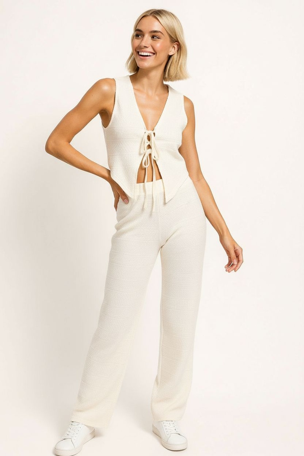 Conjunto de crepón con top sin mangas de escote en V y jareta frontal ajustable, corte ligeramente entallado que estiliza la parte superior, pantalón de tiro medio con pretina cómoda y pierna recta de caída amplia, textura ligera con acabado arrugado que aporta frescura y versatilidad
