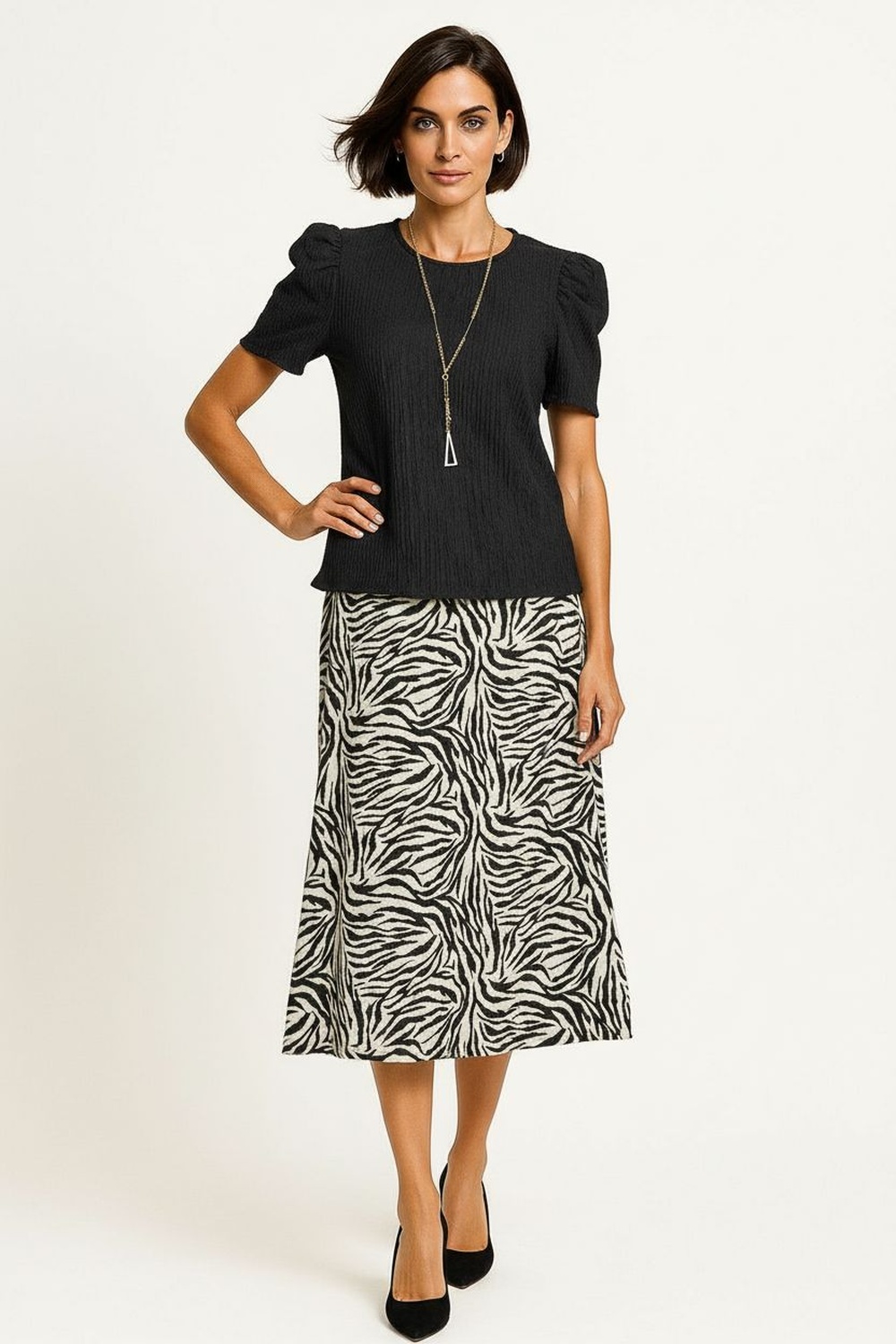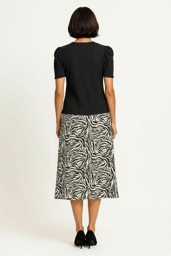 Conjunto de dos piezas que integra playera con manga corta de volumen y escote redondo que aporta un toque refinado, corte recto que brinda comodidad y caída natural, falda midi de tiro alto con pretina ancha que define la cintura y silueta fluida que proporciona libertad de movimiento y estilo contemporáneo, confeccionado en tejido suave y ligero que ofrece frescura durante el día