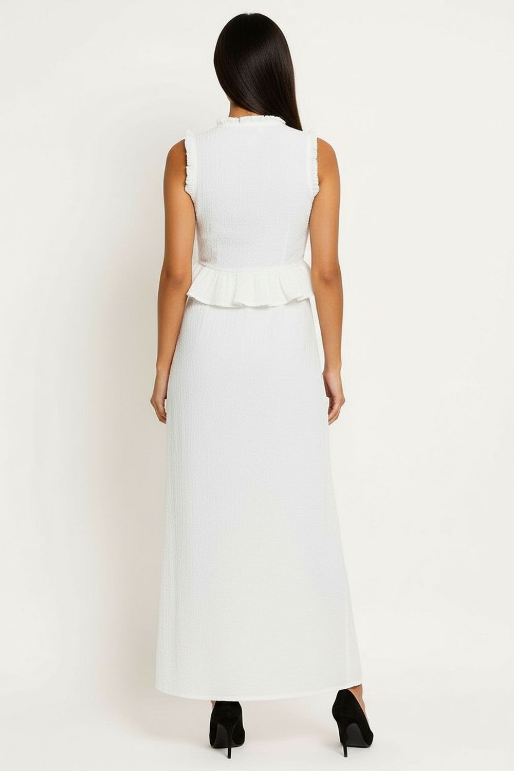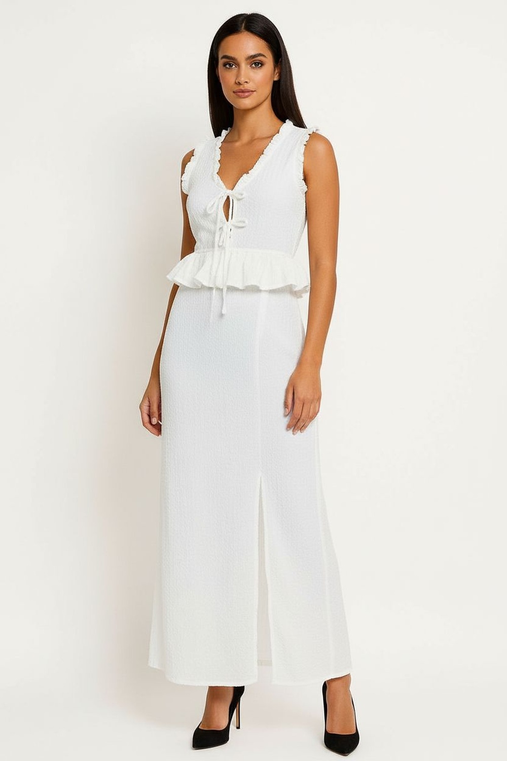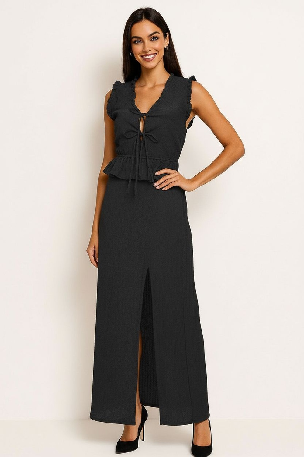 Conjunto de top sin mangas con escote profundo y detalle de amarre frontal que aporta ajuste personalizado, diseño entallado en cintura con ligero vuelo inferior que equilibra la figura, falda larga de corte recto que estiliza la silueta, pretina cómoda que se adapta con suavidad, confección en tela ligera de textura delicada y caída fluida