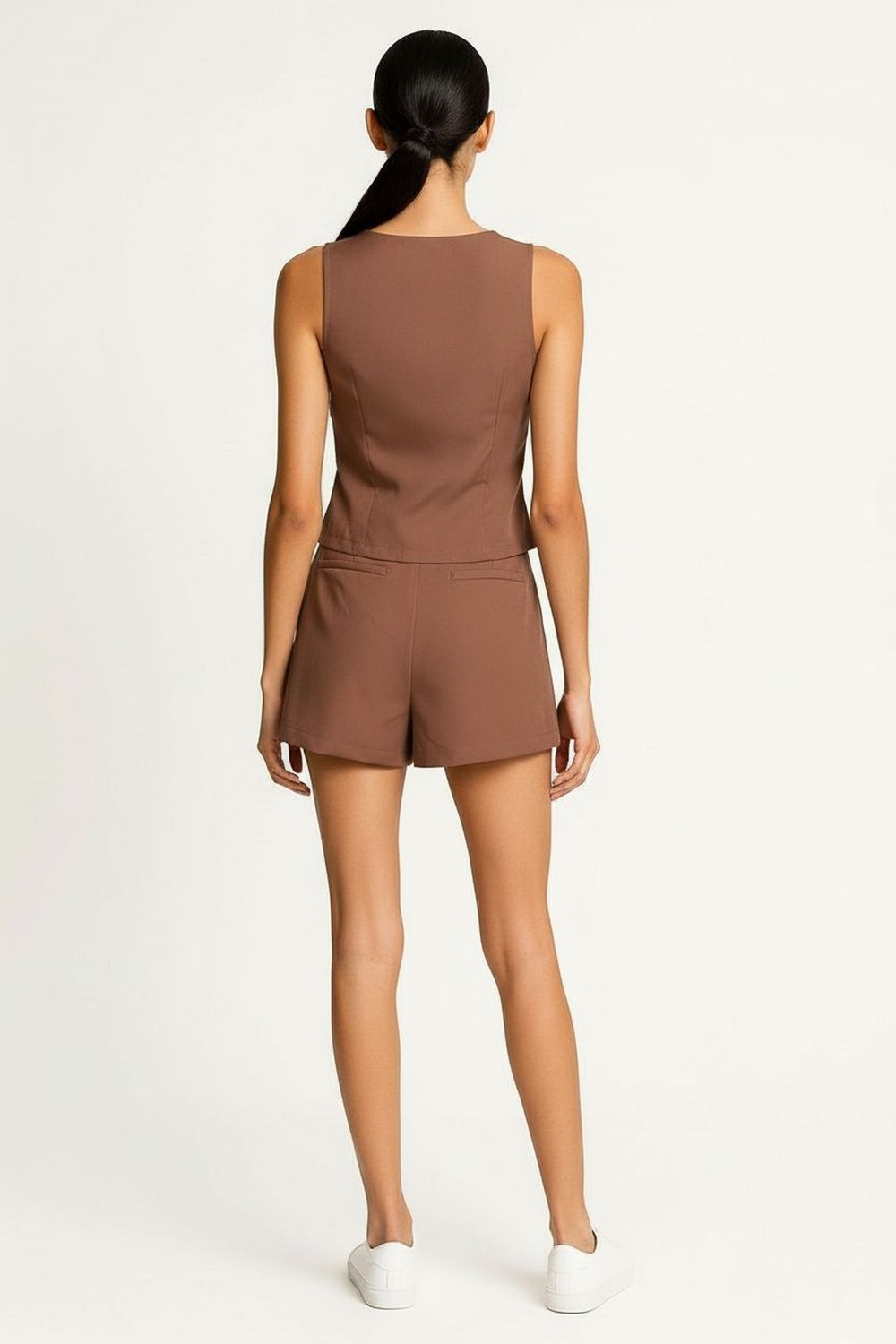 Conjunto de dos piezas con chaleco de escote en V y botonadura frontal, pantalón de tiro medio con caída amplia, estructura ligera, ajuste cómodo
