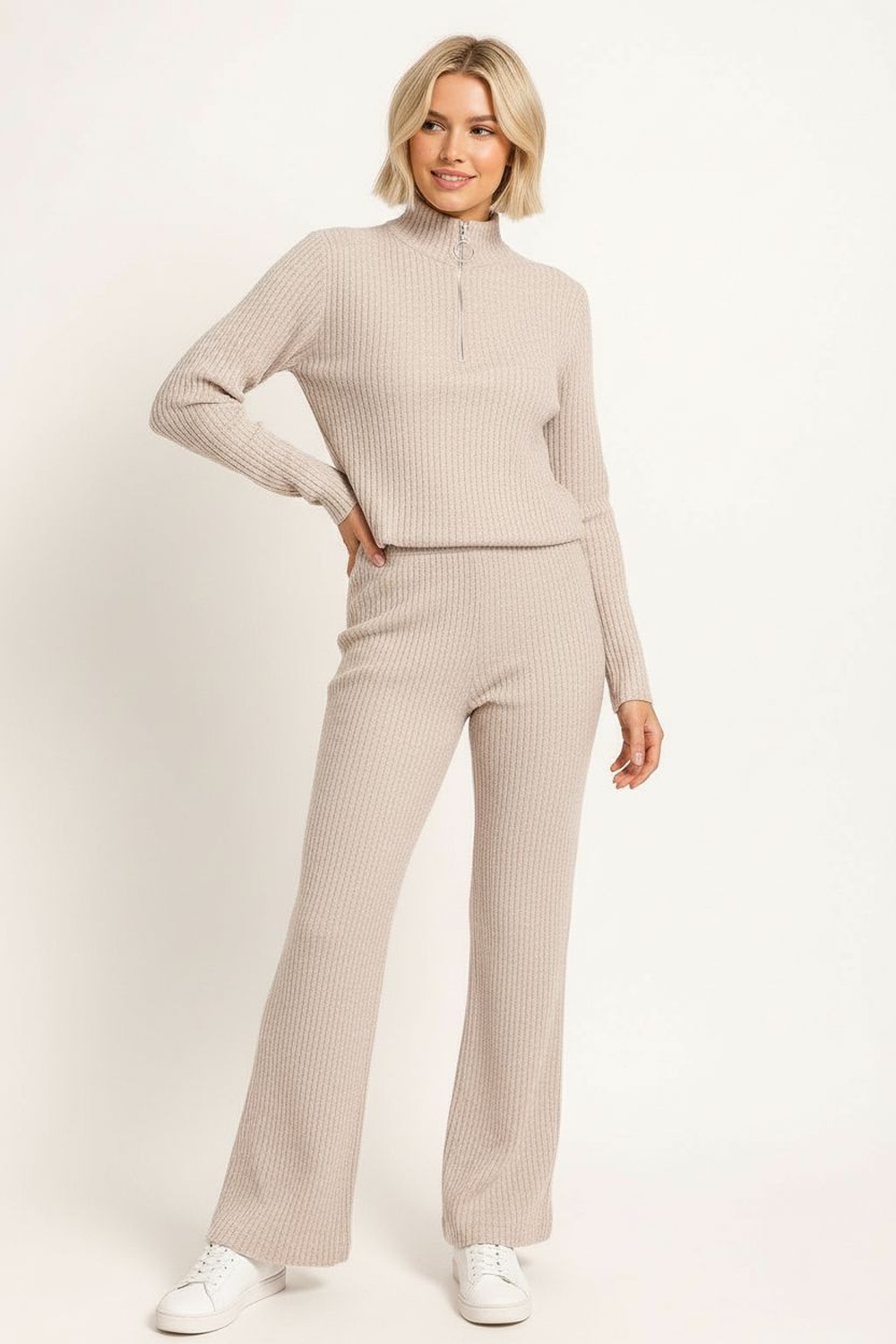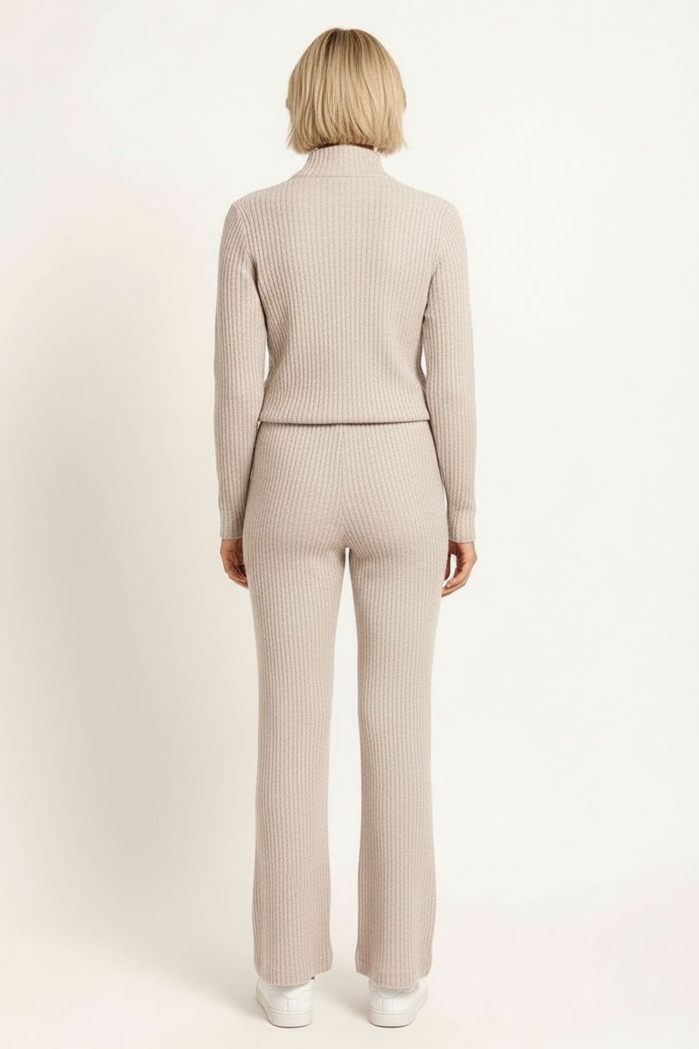 Conjunto compuesto por chaleco escotado con cierre de botones frontales y ajuste entallado que resalta la silueta, pantalón de corte amplio con pretina suave que brinda comodidad durante el movimiento, confección en tela fluida que aporta caída elegante y ligereza, acabado limpio que ofrece una apariencia moderna y sofisticada para distintas ocasiones