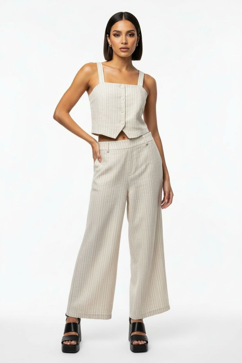 Conjunto de dos piezas con blusa de tirantes anchos, escote recto, botones frontales, pantalón de tiro alto con pretina, corte amplio, estructura ligera