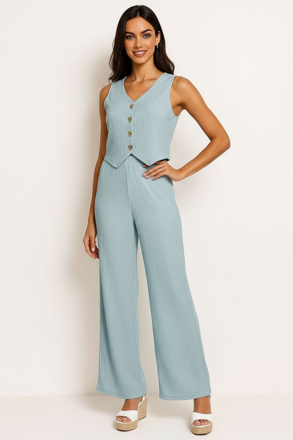 Conjunto de pantalón amplio y chaleco sin mangas con escote en V y botonadura frontal, chaleco de corte estructurado que define la parte superior, pantalón de pierna ancha con caída fluida que brinda comodidad y libertad de movimiento, confección en tela de textura uniforme que aporta presencia y estructura