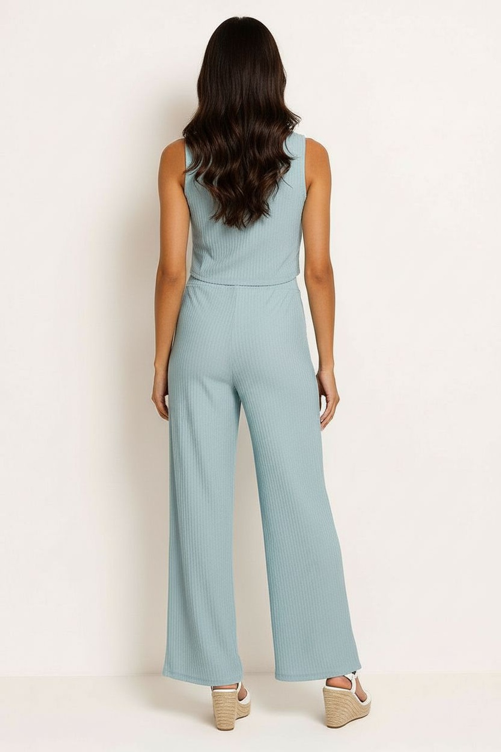 Conjunto de dos piezas con blusa sin mangas de corte recto y pantalón largo de silueta amplia, confeccionado en tejido ligero, pretina cómoda que permite ajuste natural y caída fluida en ambas piezas