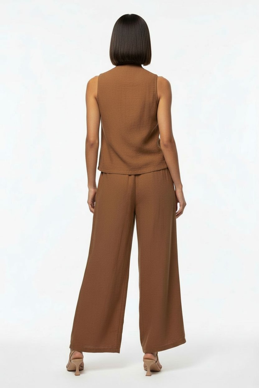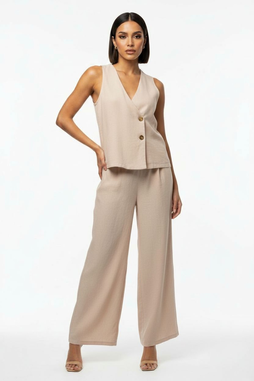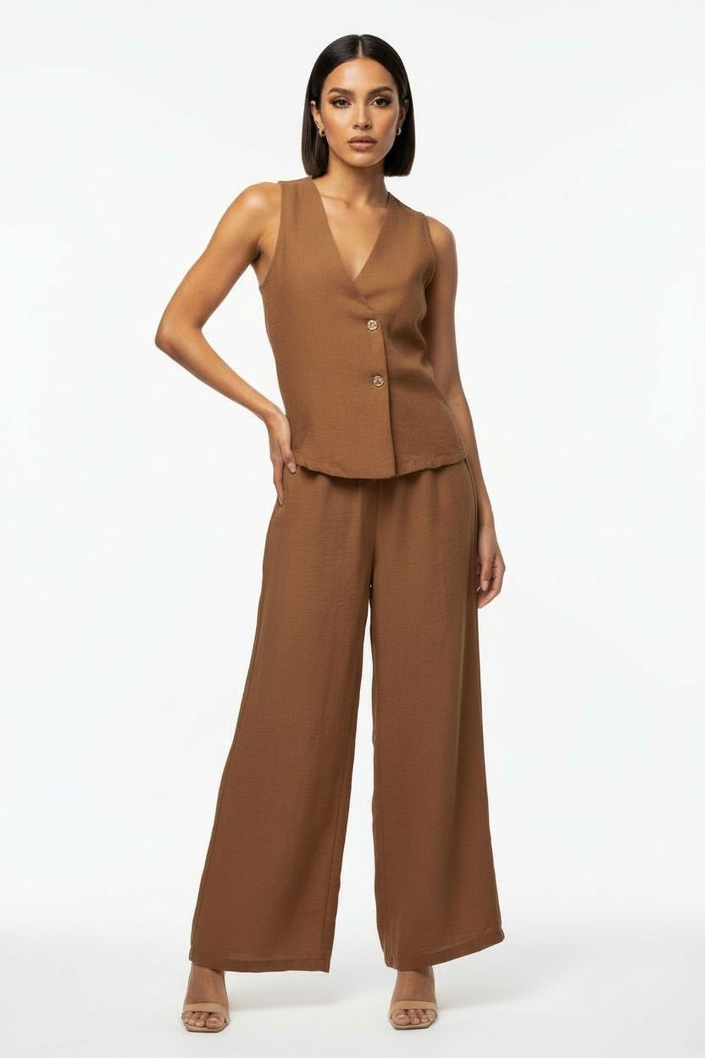 Conjunto de pantalón amplio y chaleco sin mangas con escote en V y botonadura frontal, chaleco de corte estructurado que define la parte superior, pantalón de pierna ancha con caída fluida que brinda comodidad y libertad de movimiento, confección en tela de textura uniforme que aporta presencia y estructura