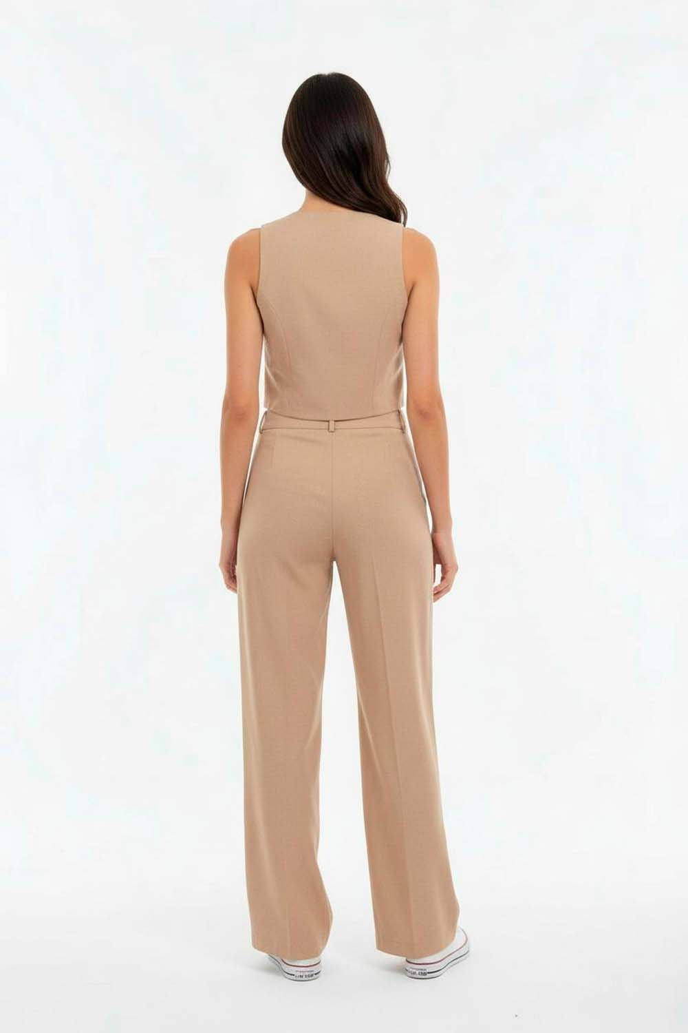 Conjunto con chaleco de escote en V y botonadura frontal, corte corto que marca la cintura, acabado estructurado con ajuste favorecedor en torso, pantalón de tiro medio con pretina elástica y pierna amplia de caída recta que brinda comodidad y movimiento, confección ligera de textura suave al tacto