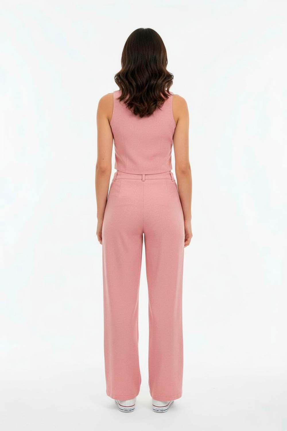 Conjunto de dos piezas con chaleco de escote en V y botonadura frontal, pantalón de tiro medio con caída amplia, estructura ligera, ajuste cómodo