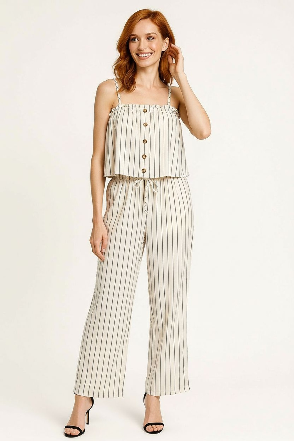 Conjunto pantalón y top, tirantes delgados, botones frontales, pretina elástica con jareta, silueta fluida, ajuste cómodo, dos piezas