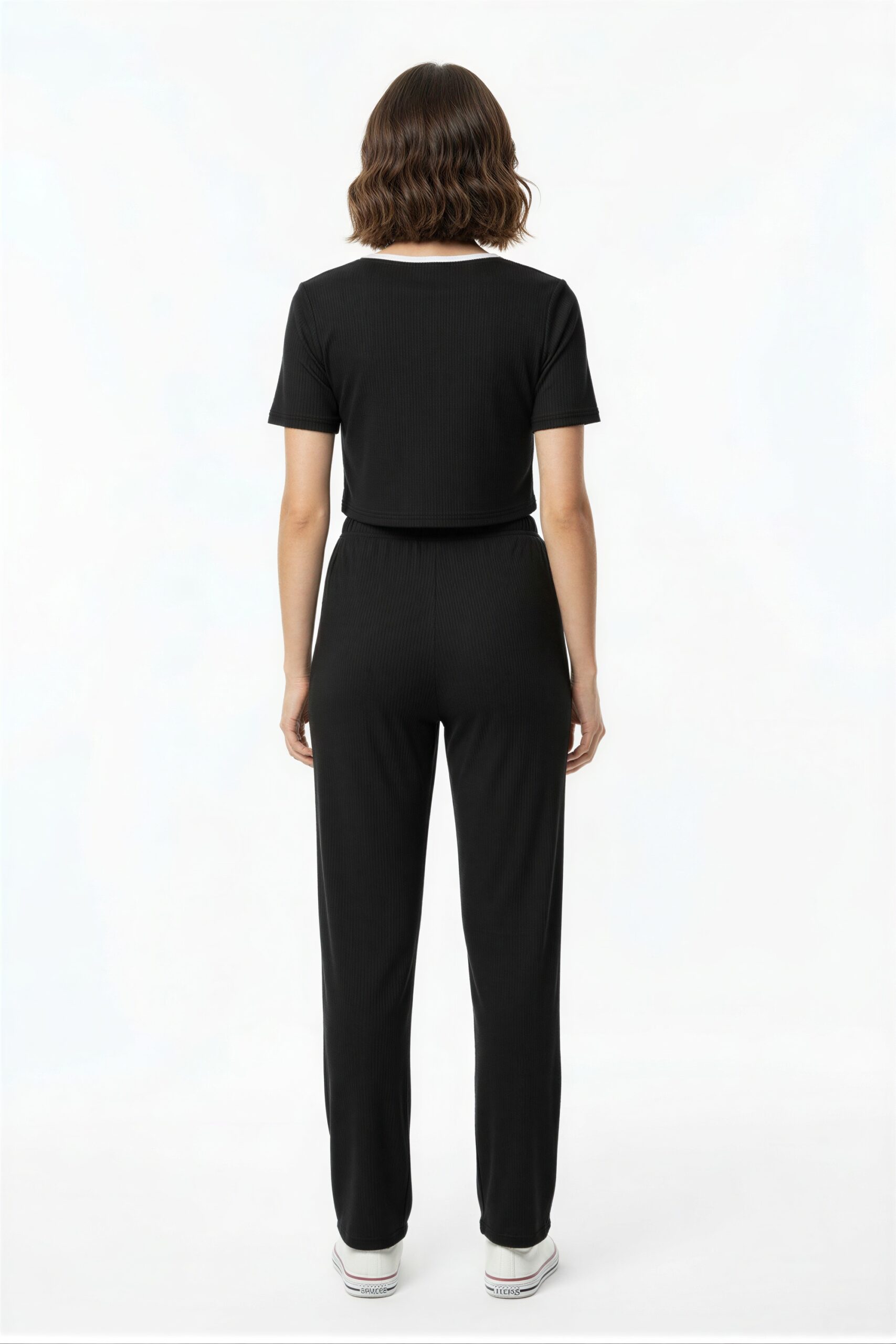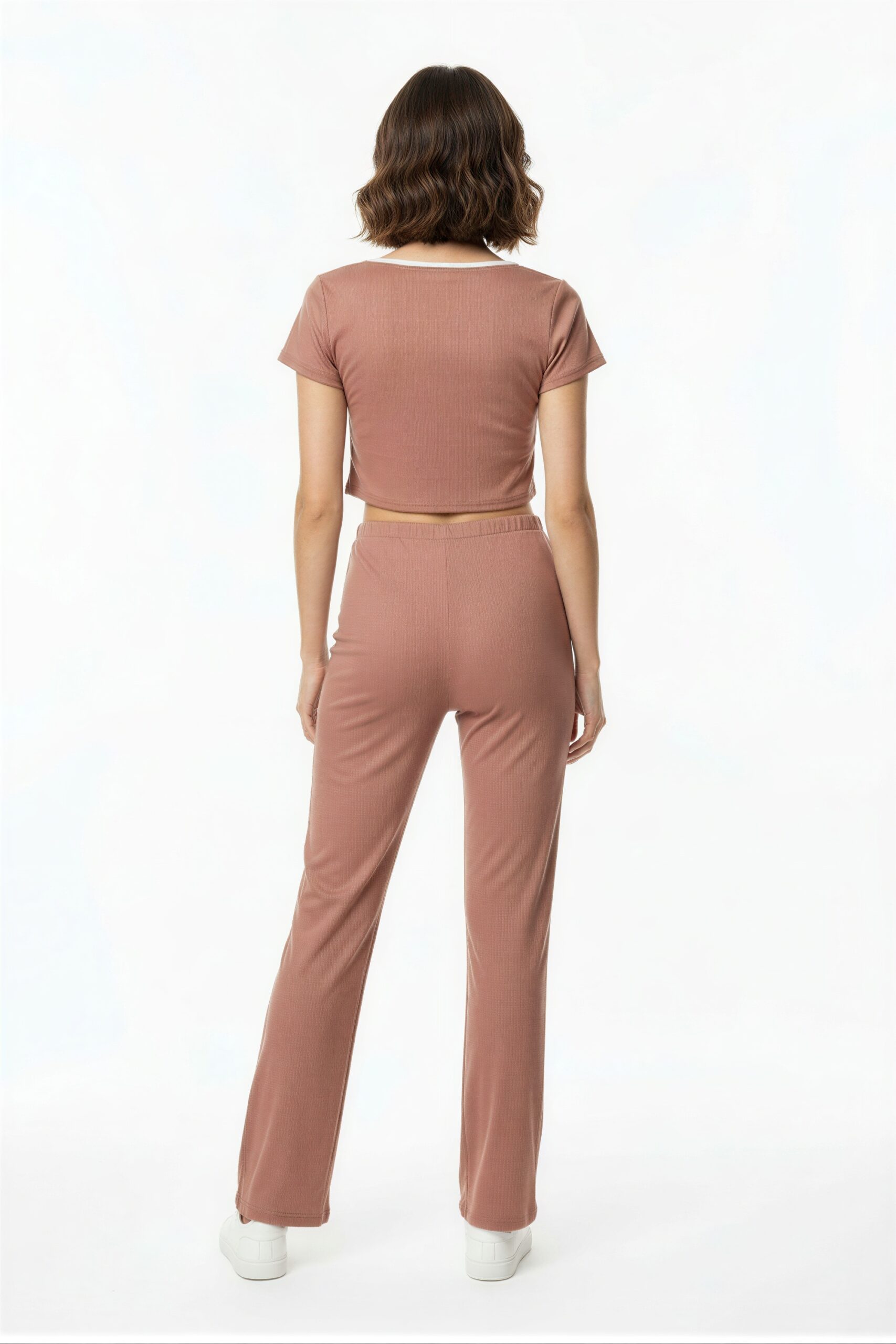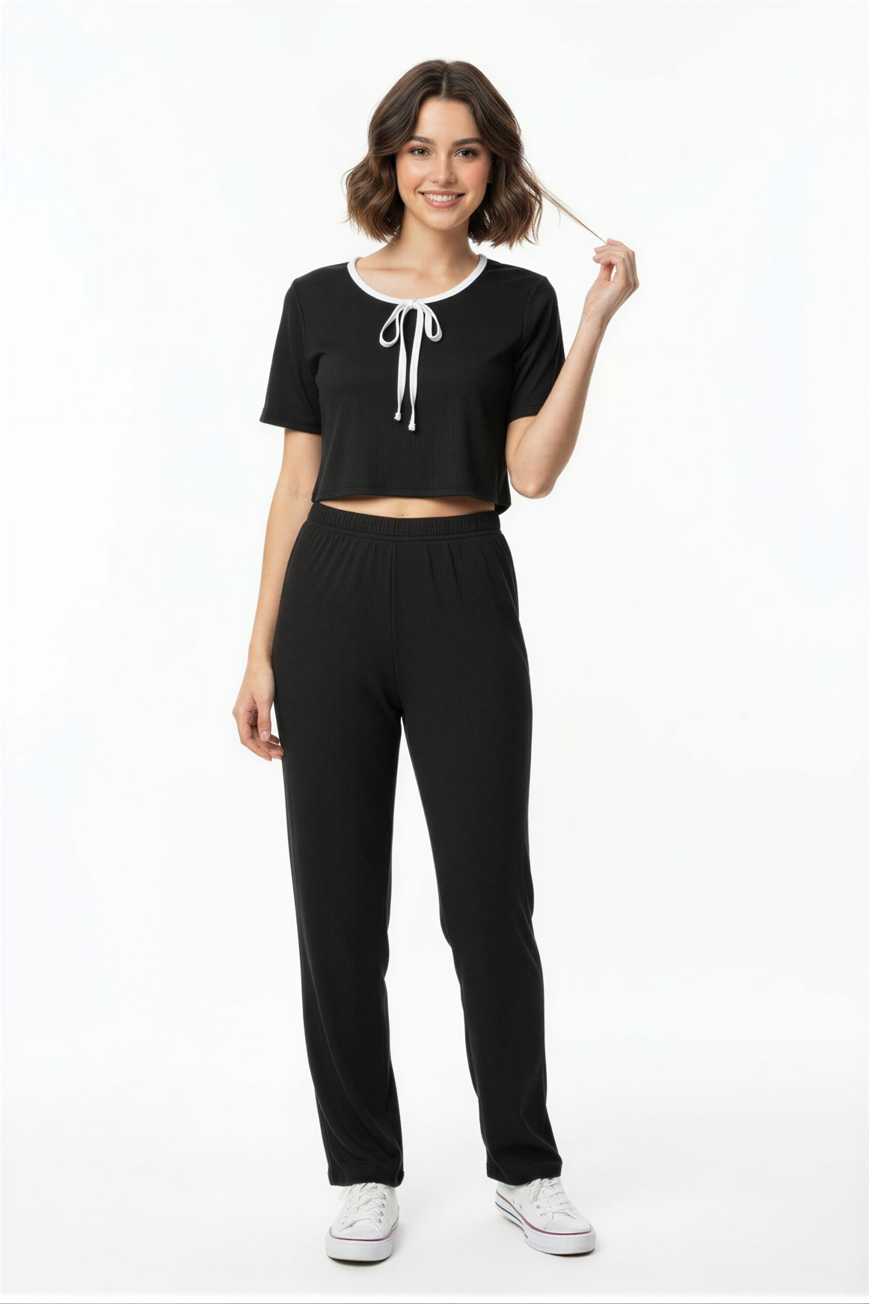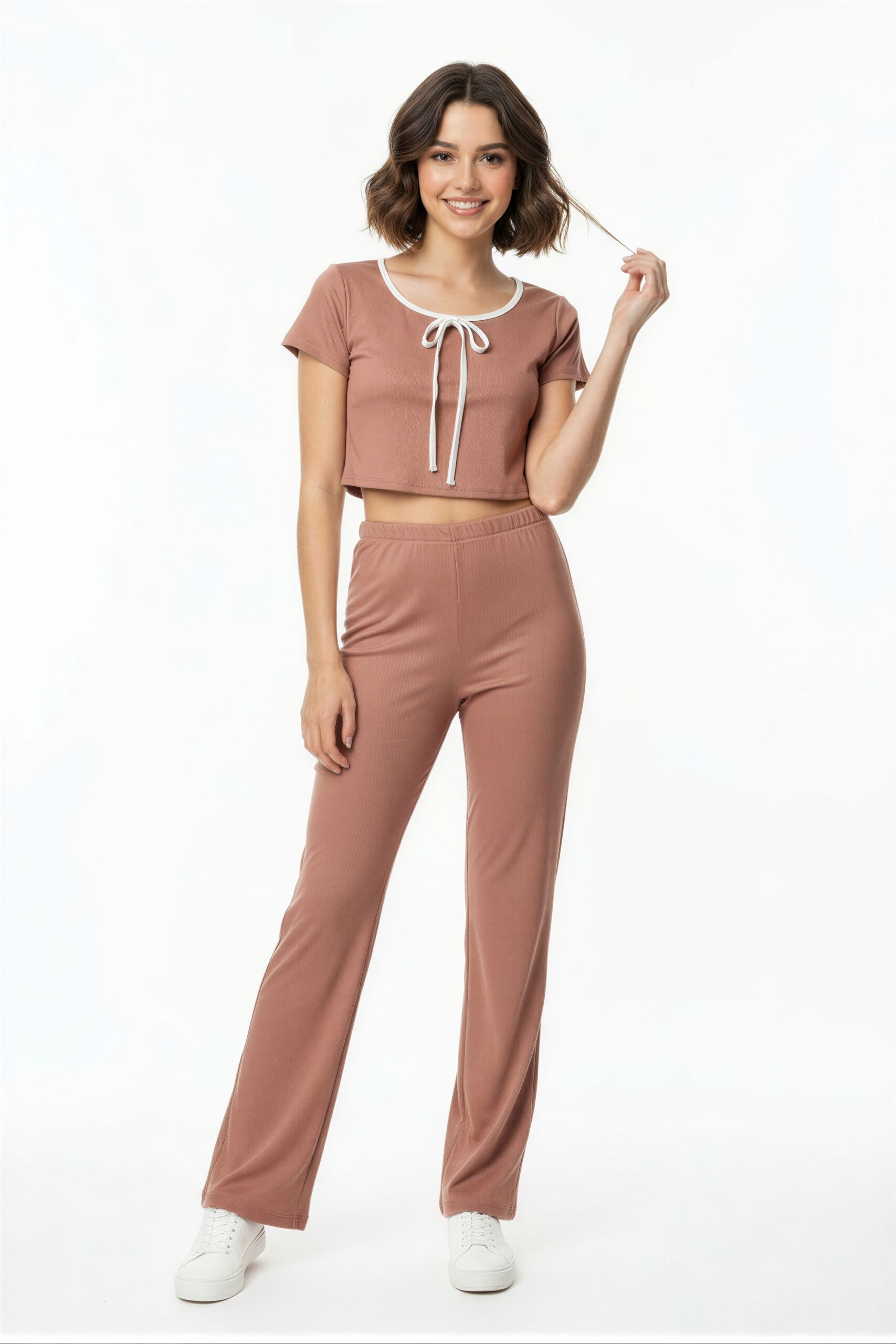 Conjunto de playera de manga corta con escote redondo y lazo frontal, acompañado de pantalón de tiro medio con pretina elástica, ajuste cómodo, terminado recto