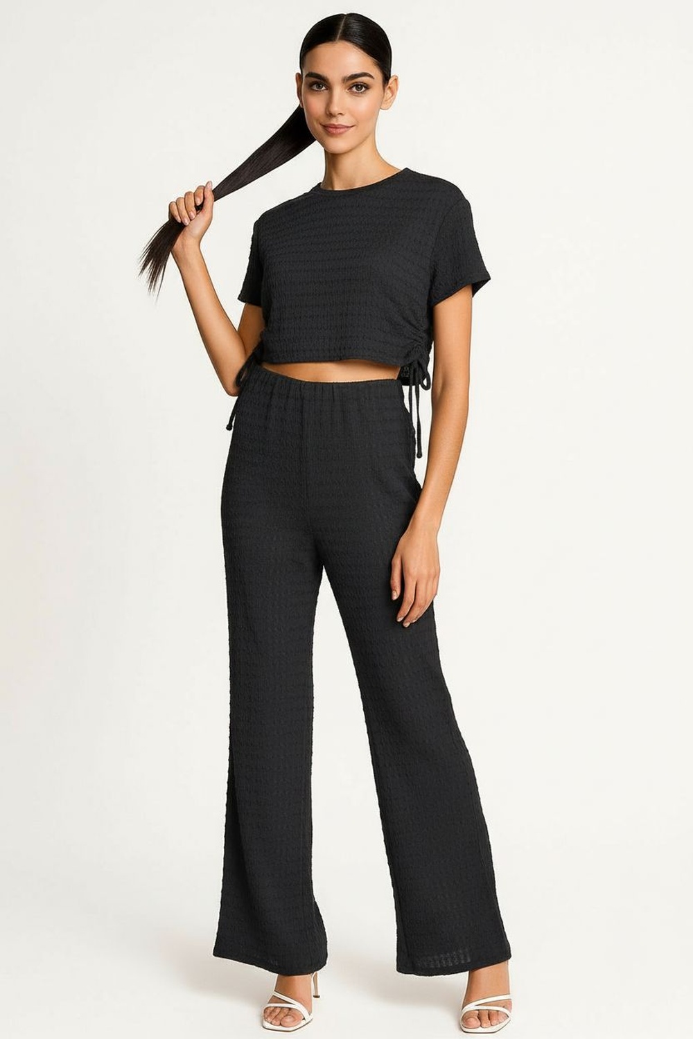 Conjunto compuesto por top corto con tirantes finos y detalles frontales decorativos, estructura que se ajusta de manera uniforme al torso, pantalón de tiro medio con corte ligeramente abierto en la parte baja, confección que equilibra firmeza y comodidad, caída continua que estiliza visualmente la figura