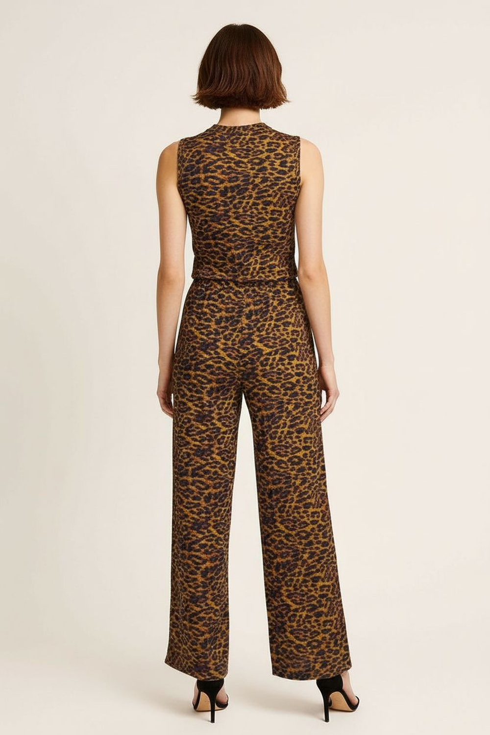 Conjunto de dos piezas en tejido de punto, top sin mangas con cuello cerrado y largo a la cintura, pantalón de tiro medio con pretina cómoda y corte amplio de pierna recta, confección ligera de movimiento natural