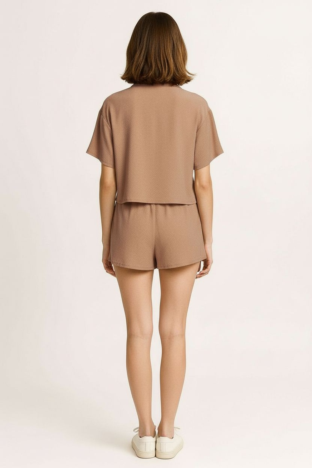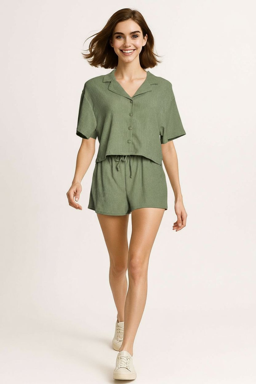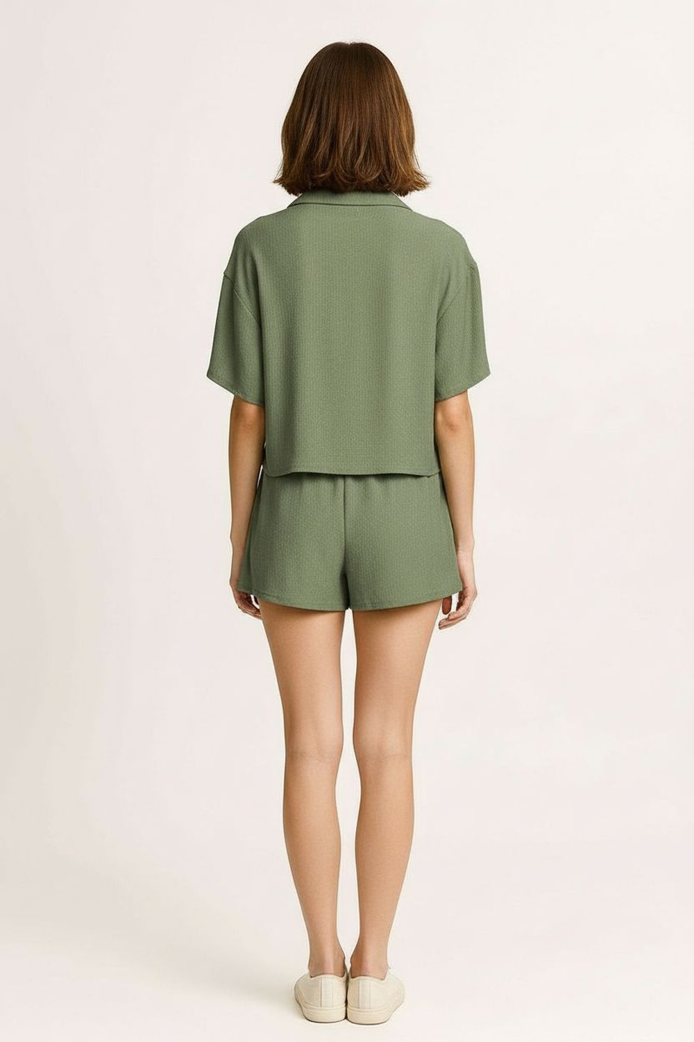 Conjunto de camisa de manga corta con cuello clásico y botonadura frontal funcional que aporta estructura, short de tiro medio con pretina cómoda y ajuste relajado, corte recto que brinda equilibrio en la silueta, confección ligera que favorece frescura y movilidad, terminado limpio en bastillas que mantiene apariencia ordenada