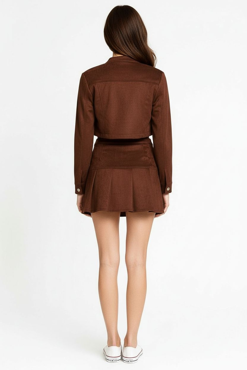 Conjunto dos piezas con top corto de cuello estructurado y botonadura decorativa que aporta detalle frontal, mangas largas que brindan soporte uniforme, falda con pretina firme y caída con pliegues que favorecen la movilidad, confección tipo gamuza que mantiene forma estable en ambas piezas