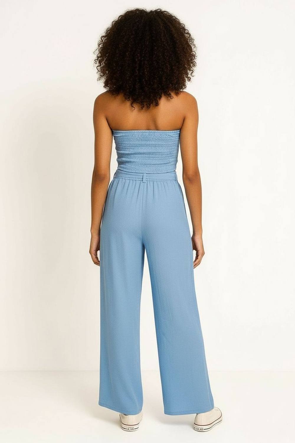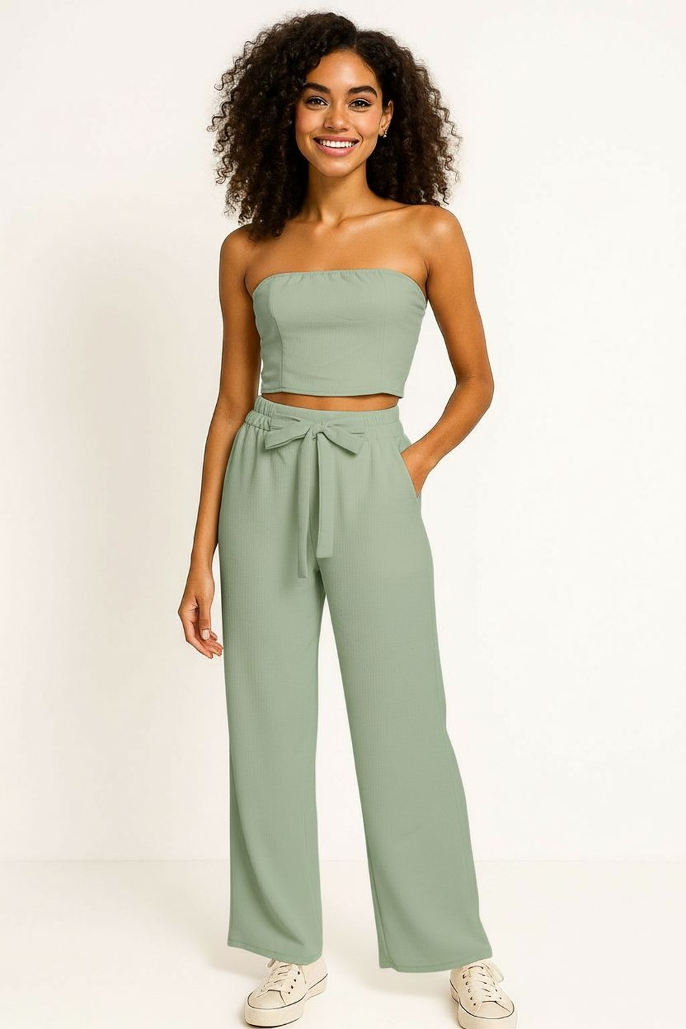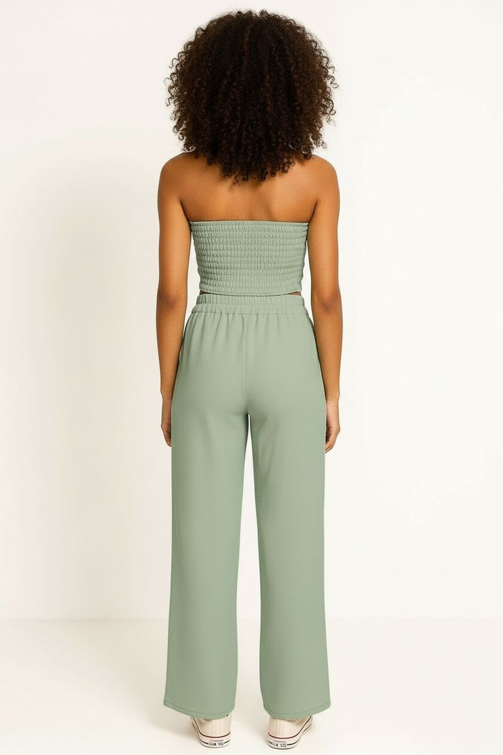 Conjunto de dos piezas compuesto por top sin tirantes de corte recto con ajuste elástico, pantalón de tiro alto con pierna amplia que brinda comodidad, pretina con jareta funcional para ajuste personalizado, largo a media pantorrilla que aporta frescura, confección ligera ideal para uso diario