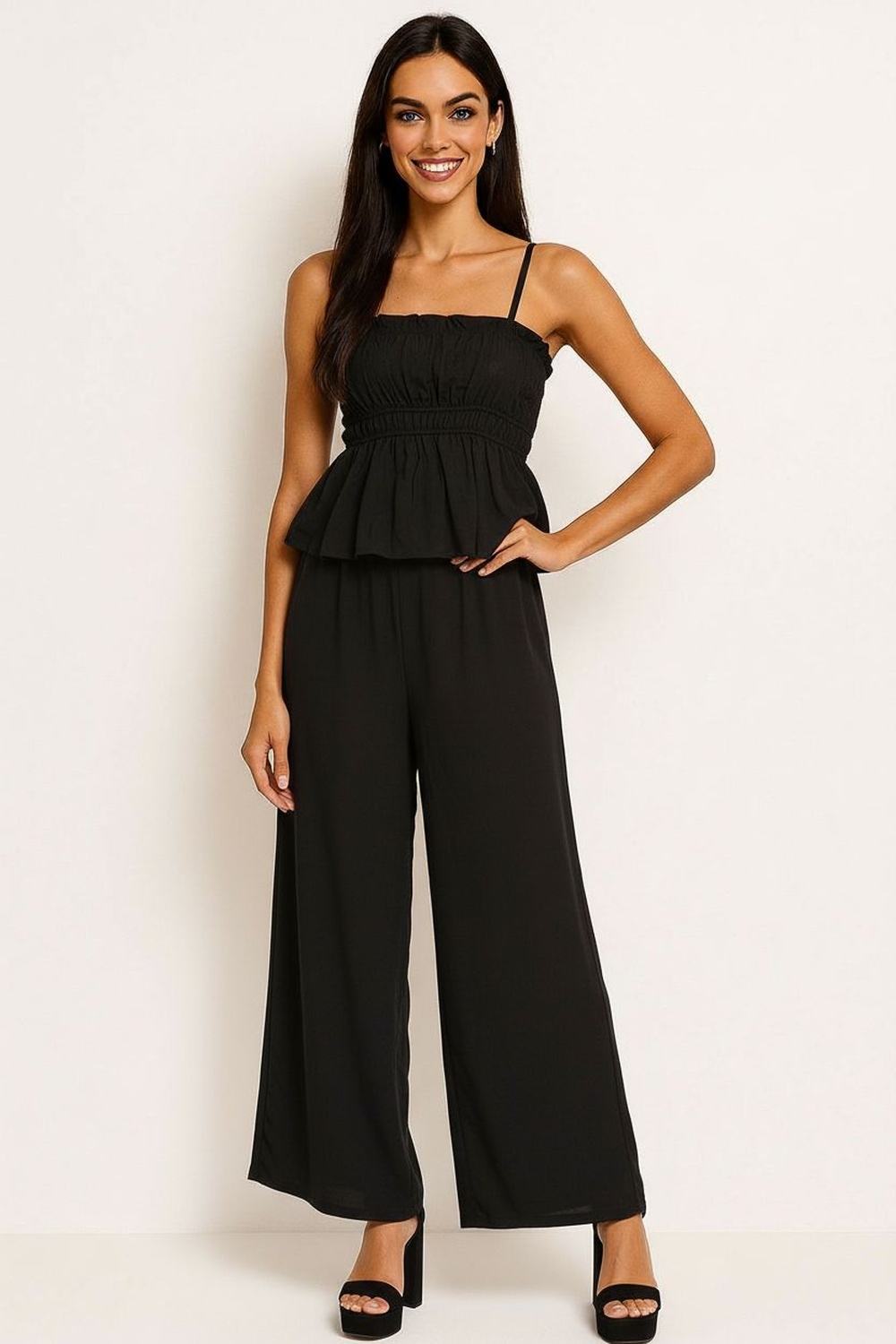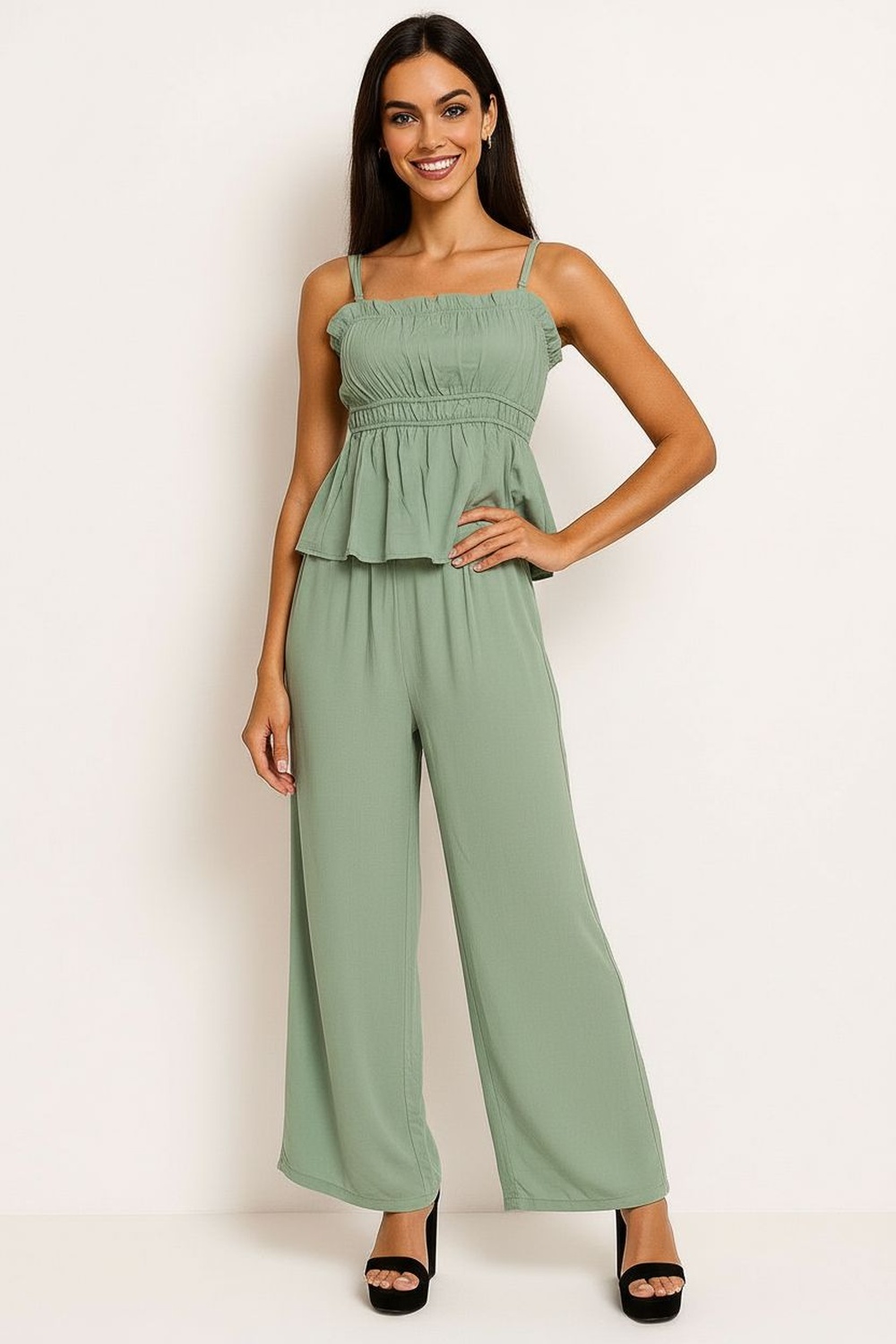 Conjunto, top con tirantes, fruncido en busto, pretina elástica, pantalón de pretina elástica, pierna amplia, caída fluida, terminaciones limpias