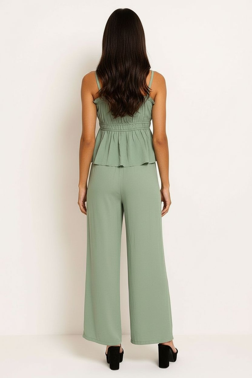 Conjunto de dos piezas blusa sin mangas cuello redondo olanes en hombro silueta recta pantalón amplio pretina cómoda pierna recta caída ligera