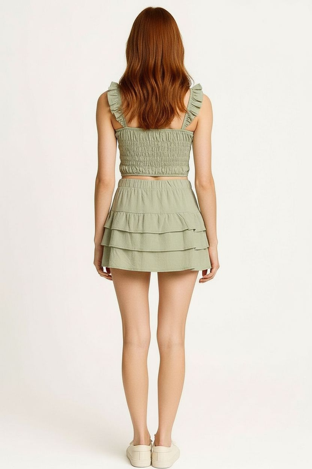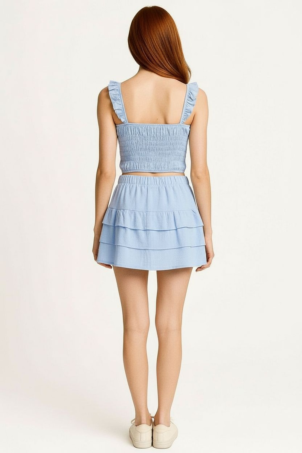 Conjunto de top con tirantes y escote recto ajuste superior y falda corta con pretina elástica diseño en capas caída ligera