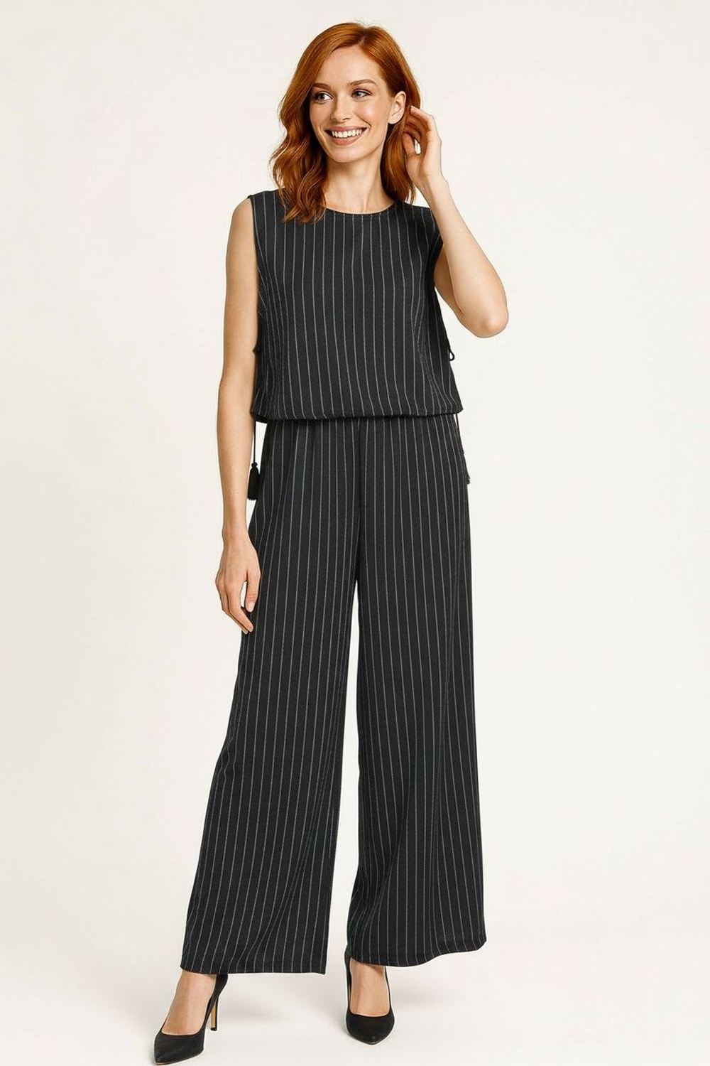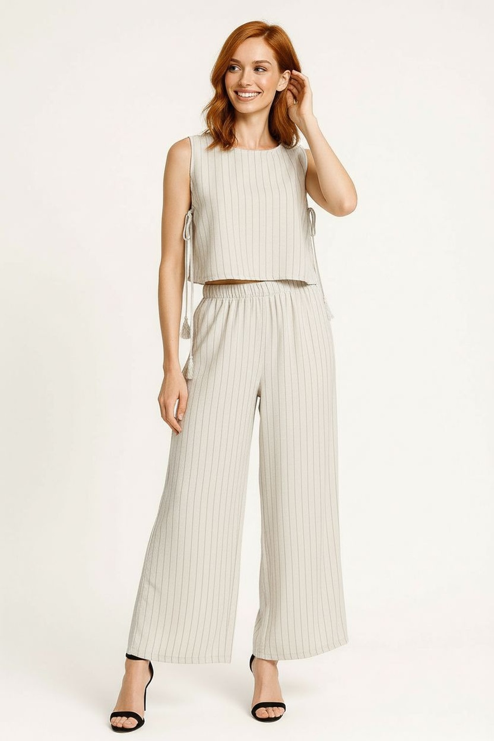 Conjunto top sin manga con cuello redondo, estructura recta con ajuste lateral, pantalón amplio de tiro medio con caída fluida, confección ligera con terminación recta