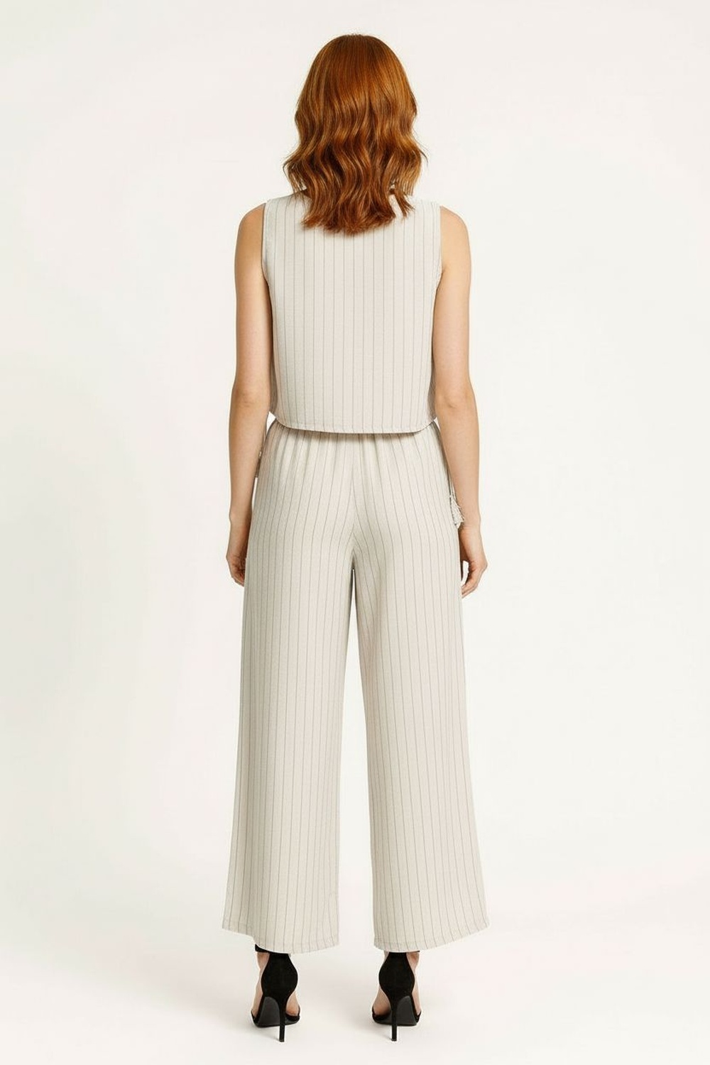 Conjunto de pantalón amplio y chaleco sin mangas con escote en V y botonadura frontal, chaleco de corte estructurado que define la parte superior, pantalón de pierna ancha con caída fluida que brinda comodidad y libertad de movimiento, confección en tela de textura uniforme que aporta presencia y estructura