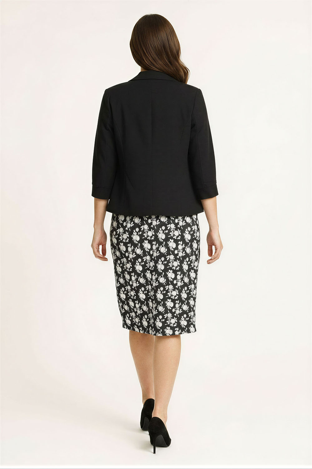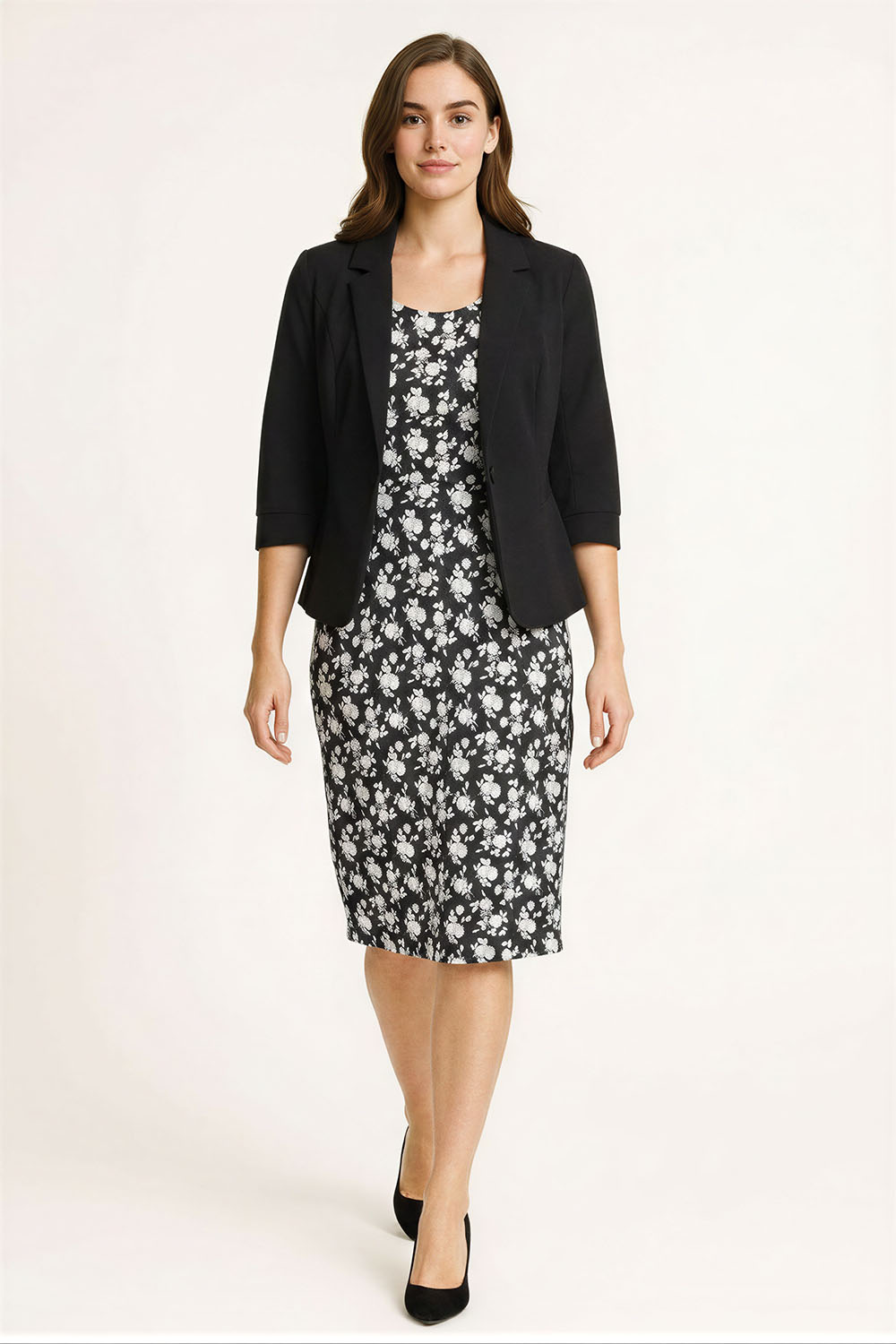 Conjunto de vestido con saco de corte recto que brinda una apariencia estructurada, vestido de largo a la rodilla con caída suave que favorece el movimiento, escote en forma amplia que aporta frescura, saco con solapa clásica y manga media que complementa la prenda con un acabado versátil