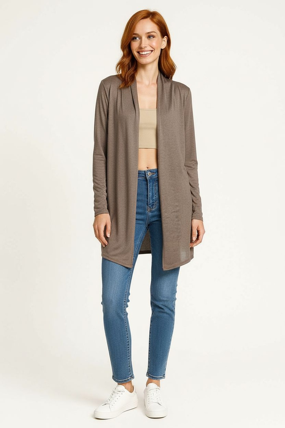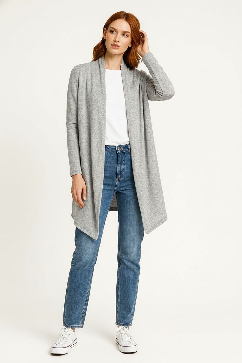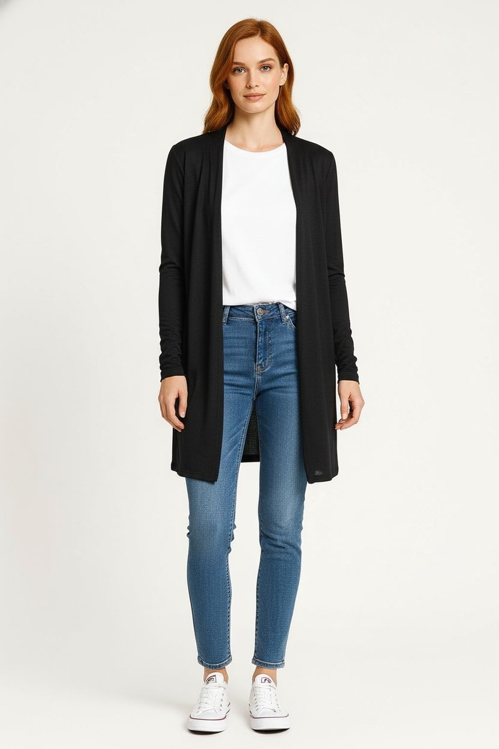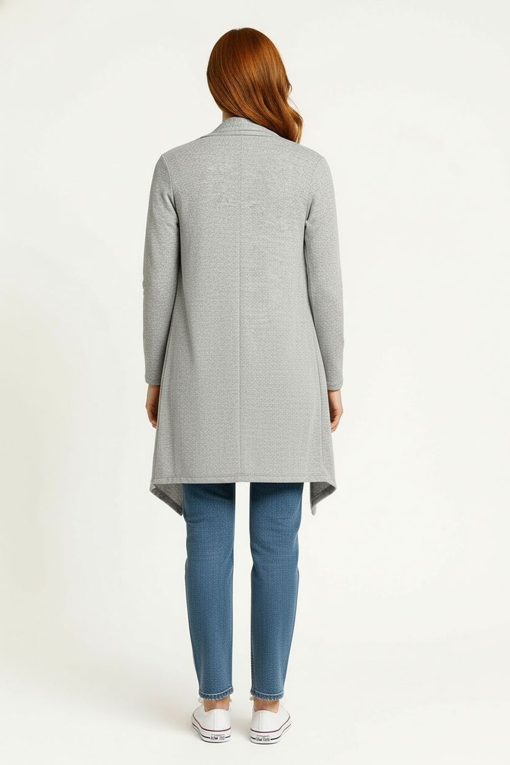 Ensamble abierto ligero con diseño de solapa sutil y caída natural que aporta movimiento, mangas largas que ofrecen comodidad, silueta recta que permite versatilidad para combinar con distintas prendas, ideal para usar en capas y complementar looks casuales o de oficina con un toque moderno