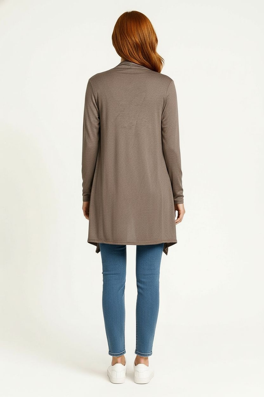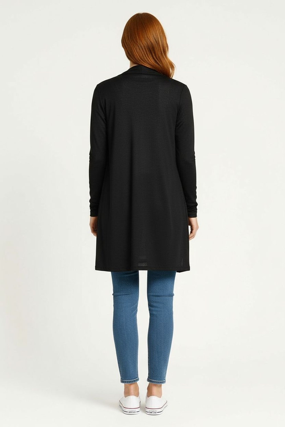 Ensamble abierto de corte largo con terminación en pico al frente, confección en tejido ligero con textura suave que aporta fluidez al movimiento, cuello caído y mangas largas que estilizan el contorno, acabados precisos que ofrecen una apariencia pulida y elegante