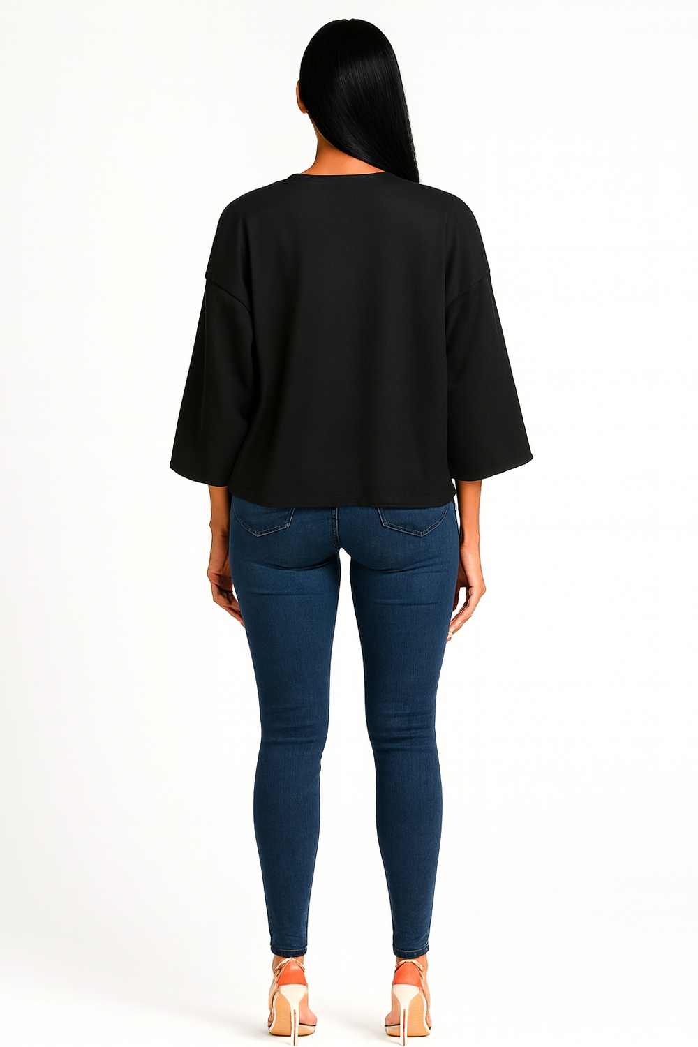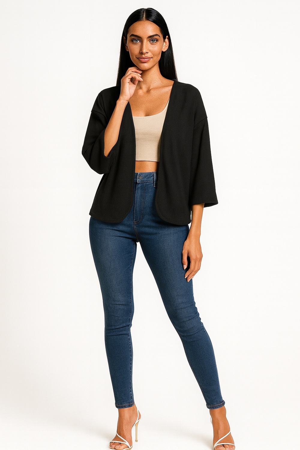 Ensamble ligero con solapa amplia que aporta caída elegante, manga tres cuartos con puño que mejora el ajuste, diseño abierto al frente que permite mayor movilidad, corte recto que ofrece versatilidad y comodidad, confeccionado en tejido suave y flexible que brinda una sensación ligera y sofisticada