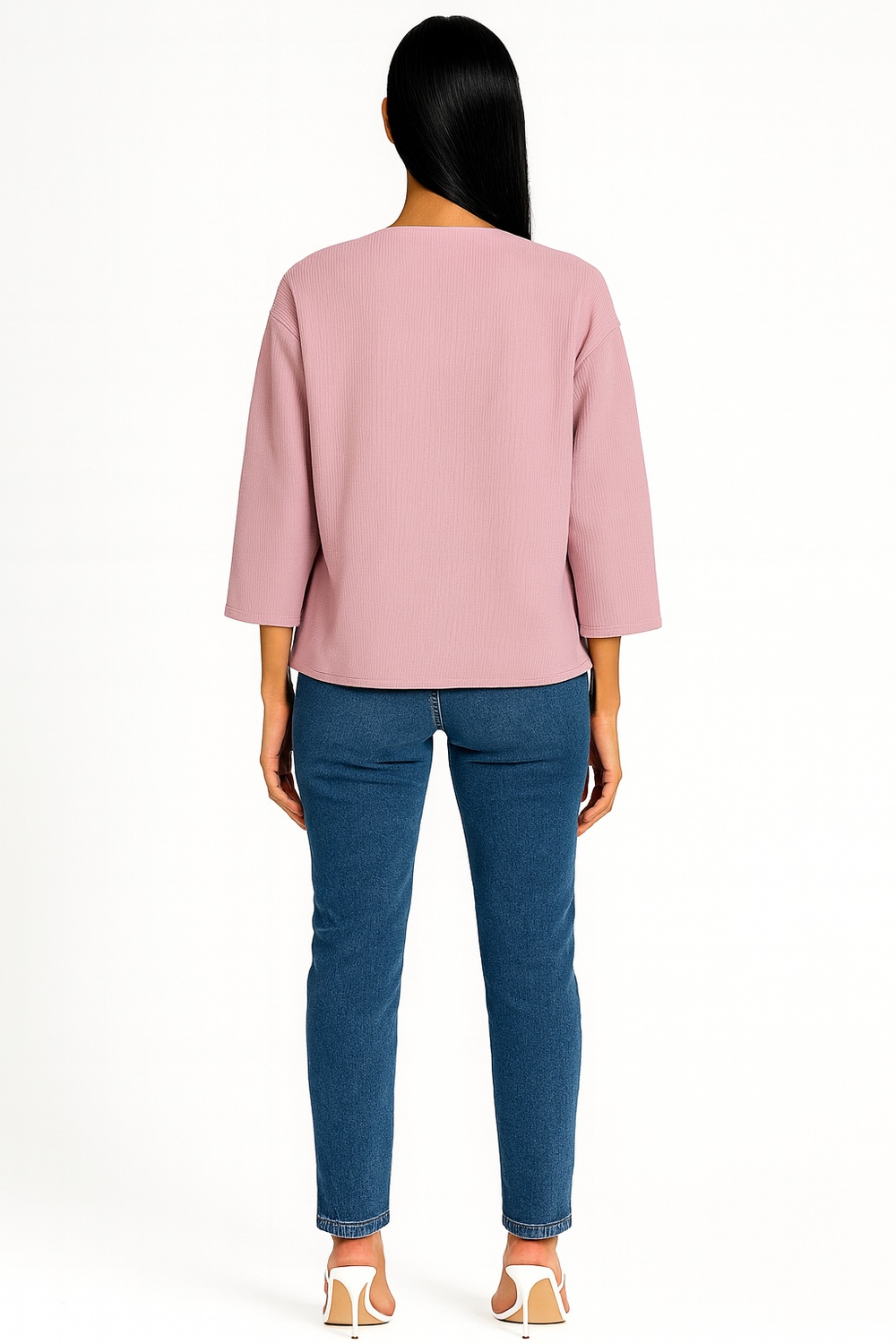Ensamble con solapa frontal abierta que aporta caída fluida, manga larga de corte recto que brinda cobertura ligera, largo medio que equilibra la silueta, diseño sin cierre para colocación práctica, confección en tejido suave de tacto ligero que permite uso continuo
