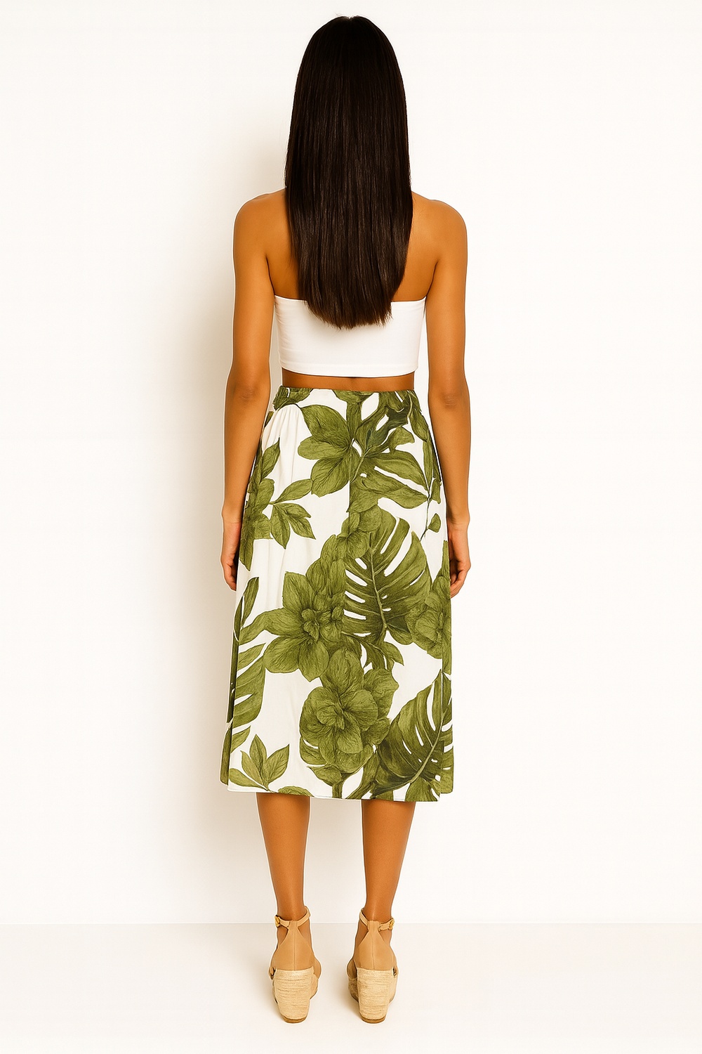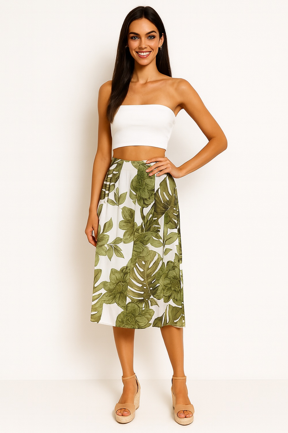Falda larga de corte amplio con pretina cómoda y cinturón ajustable que define la cintura, diseño en bloques con olanes que generan volumen y movimiento fluido, largo midi con caída ligera que estiliza la silueta, confección fresca y suave que brinda comodidad durante todo el día