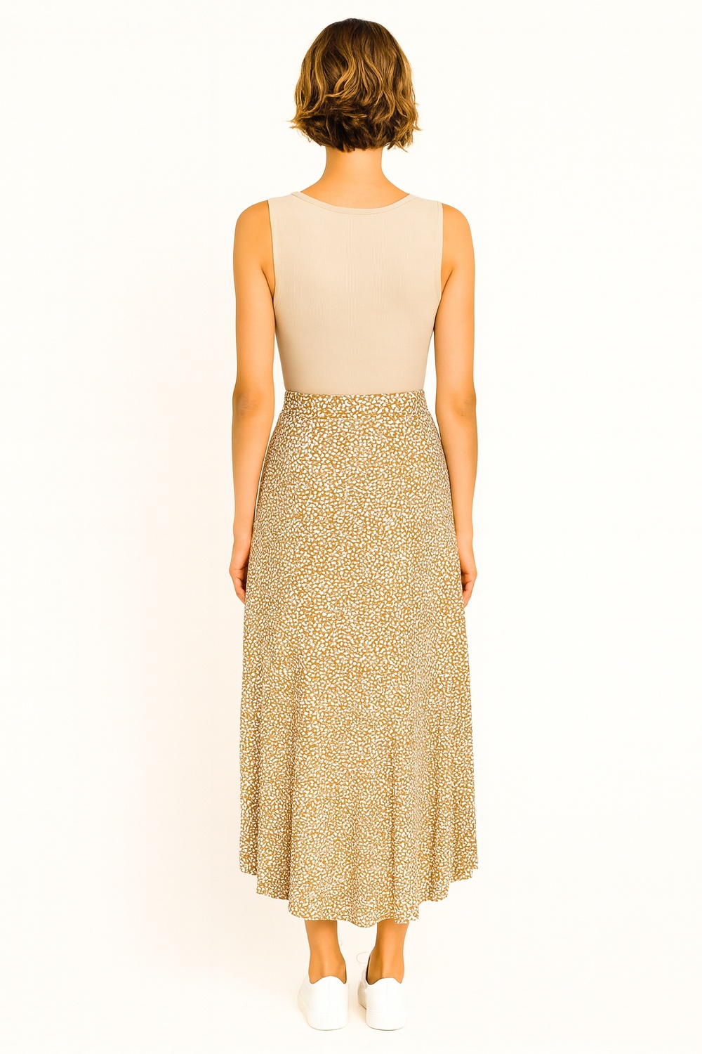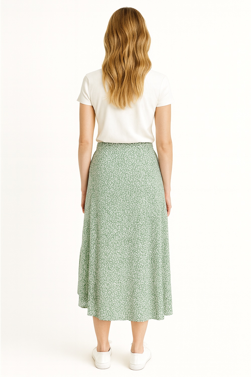 Falda de largo midi con diseño envolvente y pretina alta que ajusta de forma natural, confección en tejido ligero con caída fluida que aporta movimiento, abertura frontal que facilita el desplazamiento, ajuste mediante amarre lateral que permite adaptación al cuerpo, terminaciones suaves en el bajo