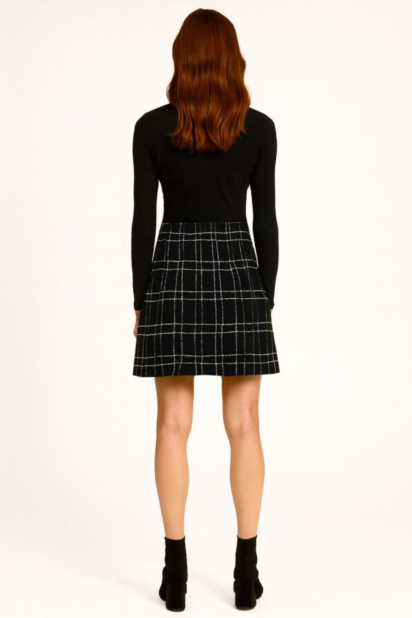Falda corta con diseño estructurado y botones frontales que aportan un toque elegante, pretina ancha que brinda ajuste firme y cómodo, bolsas decorativas con borde texturizado que añaden detalle distintivo, confección en tejido firme con caída definida que realza la silueta y proporciona una apariencia sofisticada