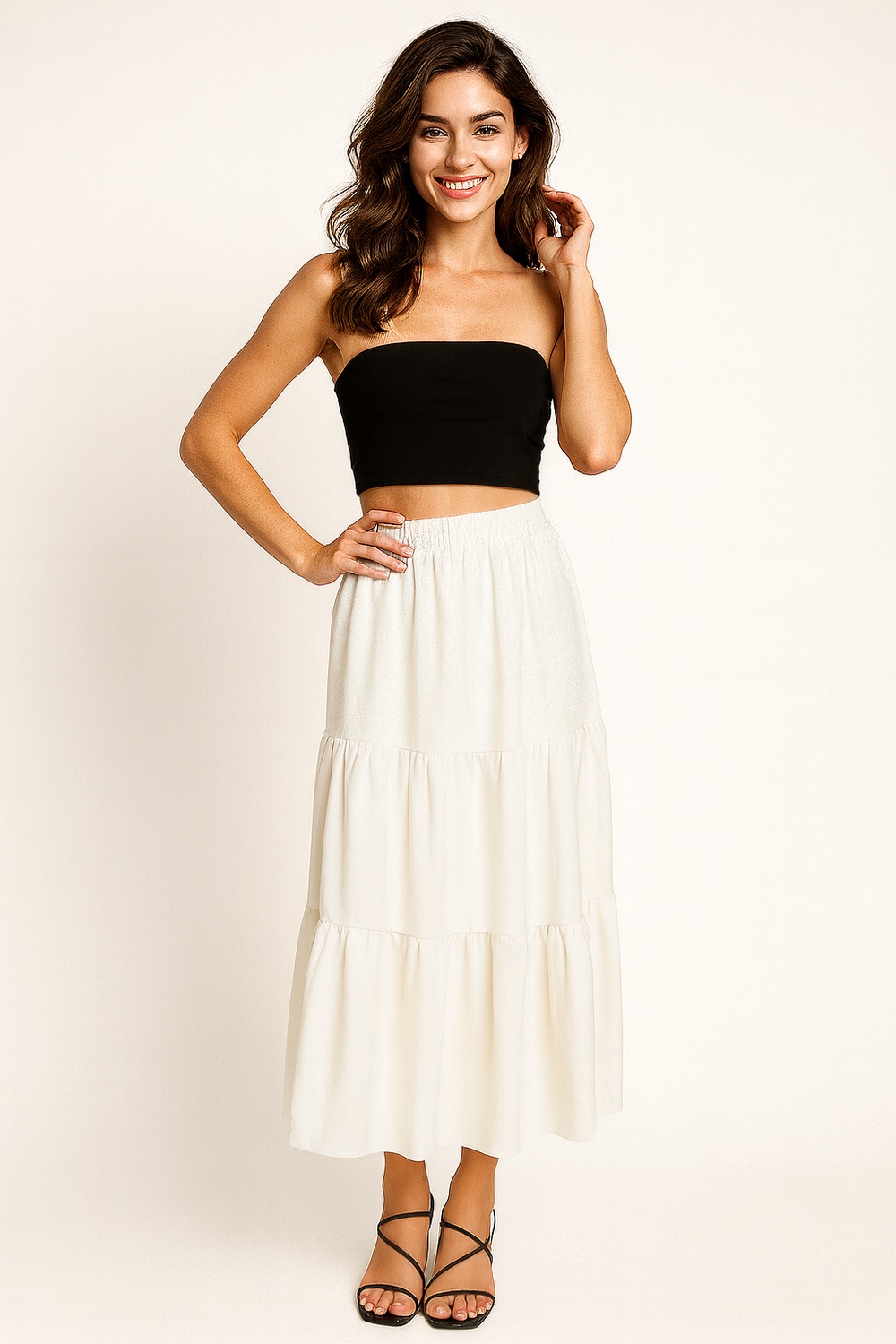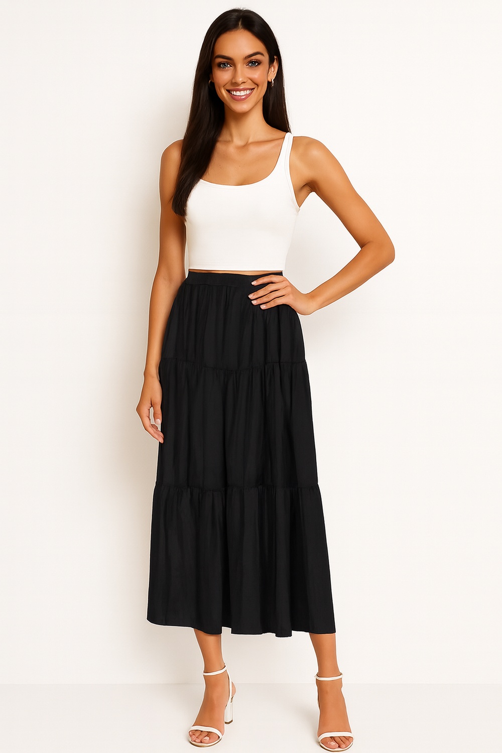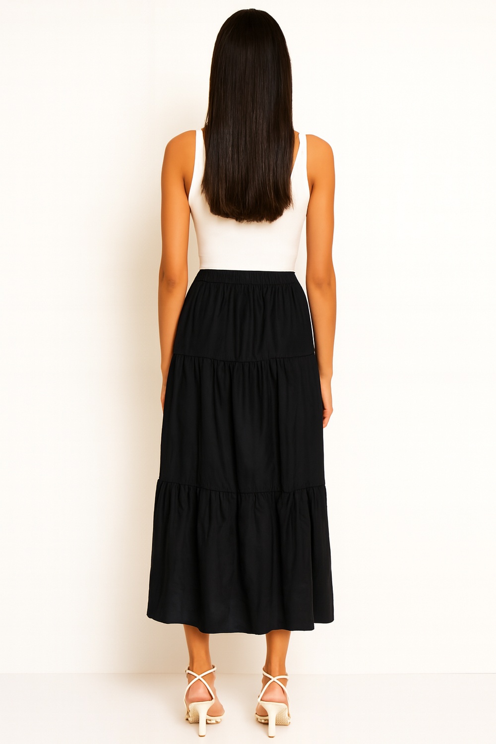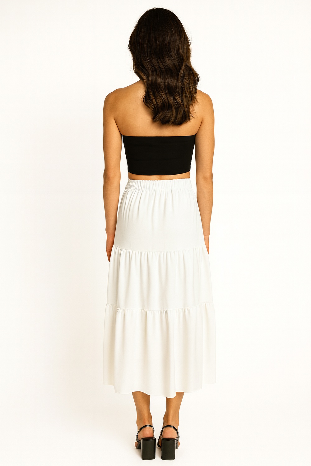 Falda de largo midi con diseño en gajos que aporta volumen equilibrado, pretina elástica que brinda ajuste cómodo a la cintura, confección en tejido ligero con caída fluida, estructura escalonada que añade movimiento, terminación amplia en el bajo