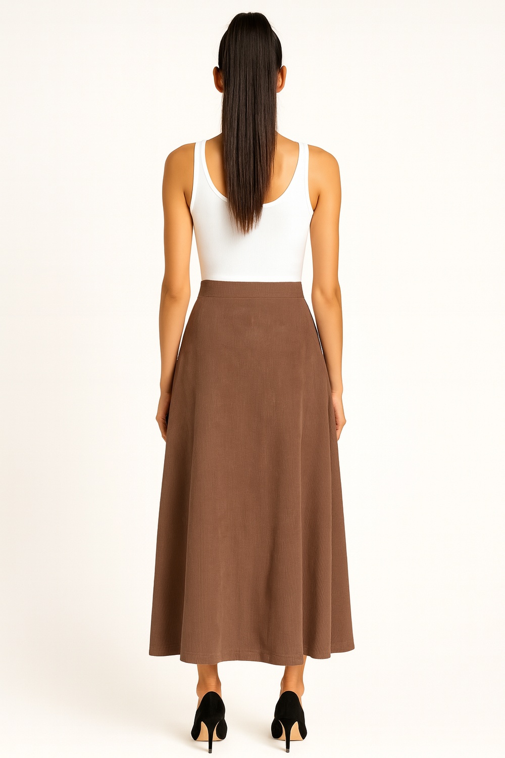 Falda circular de corte amplio con pretina ancha que brinda ajuste firme y cómodo, confección en tejido de punto con textura ligera que otorga fluidez al caminar, diseño que permite un movimiento natural y estilizado