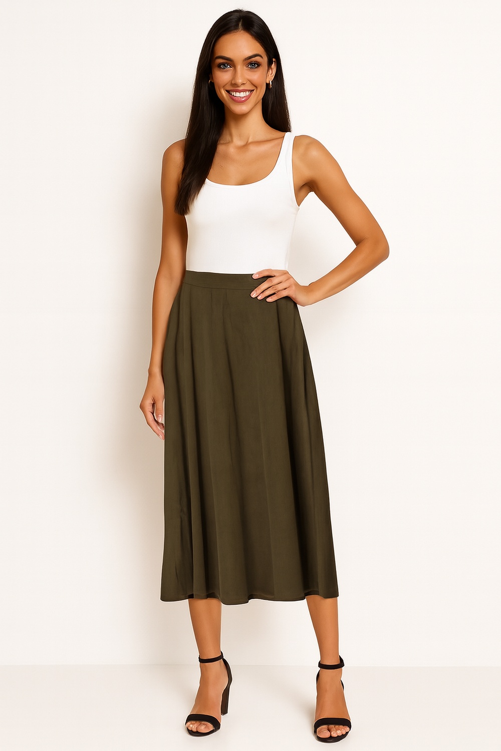 Falda de largo midi con pretina elástica que se ajusta a la cintura con comodidad, cinta decorativa al frente que realza el diseño, bolsas laterales funcionales que aportan practicidad y detalle moderno, confección en tela fresca con caída natural