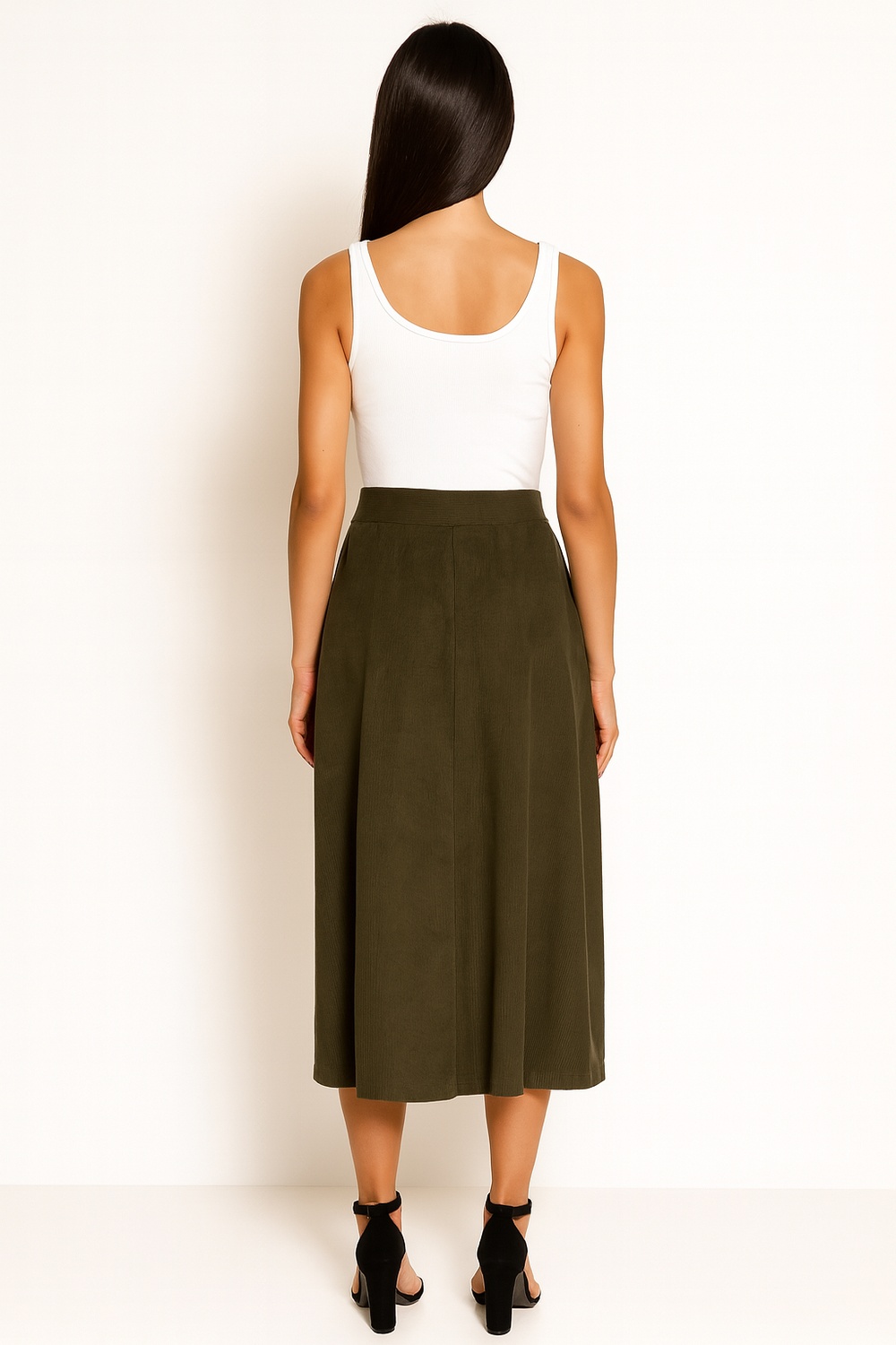 Falda de tiro alto con corte midi y botonadura frontal, diseño con pinzas que estilizan la silueta y brindan ajuste favorecedor, pretina ancha que asegura comodidad, confeccionada en tejido ligero de caída fluida que aporta frescura y movilidad, terminaciones resistentes que garantizan durabilidad
