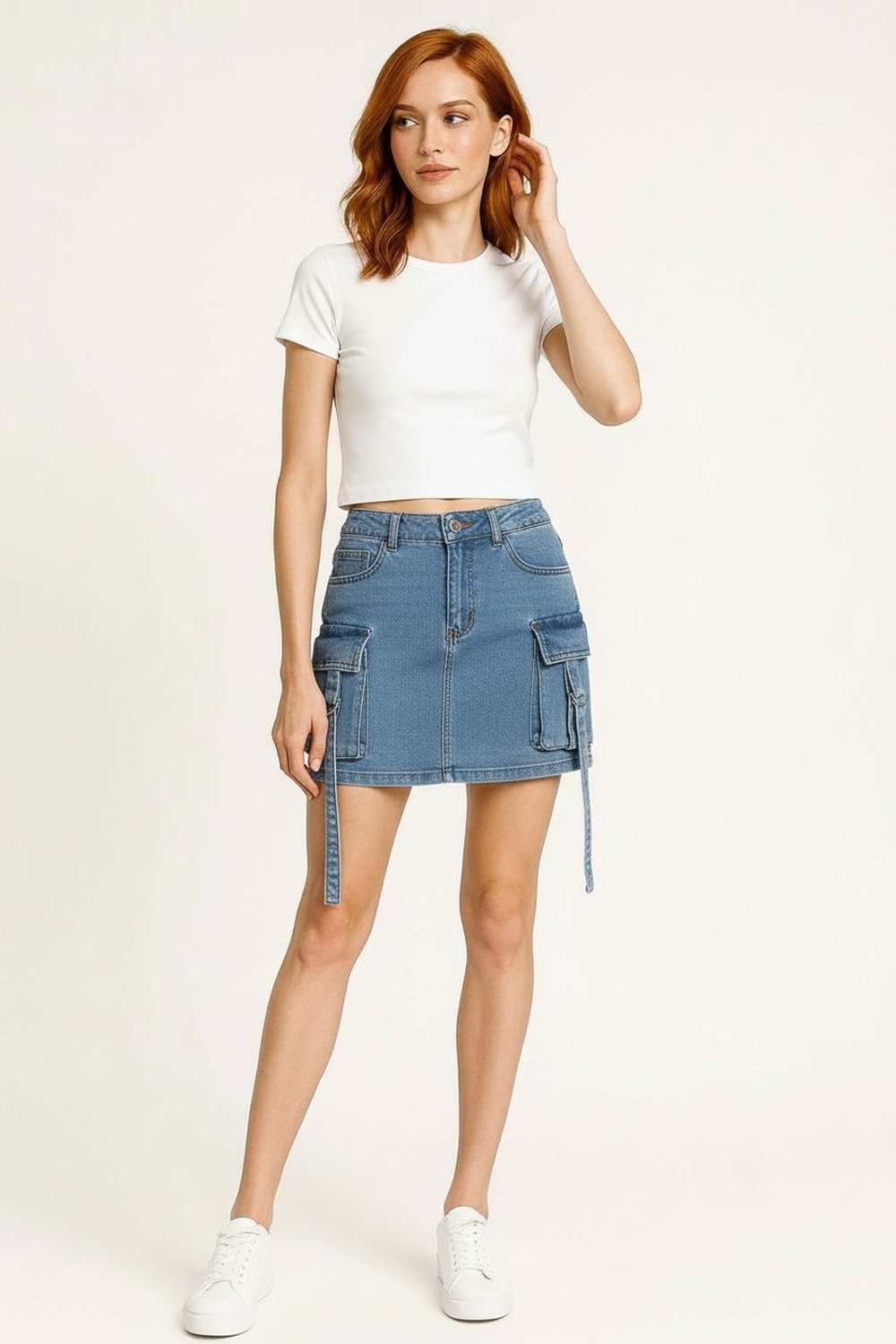 Minifalda con pretina fija, cierre frontal con botón y cremallera, bolsillos delanteros funcionales, bolsas laterales con tapa y ajuste, costuras marcadas, estructura firme