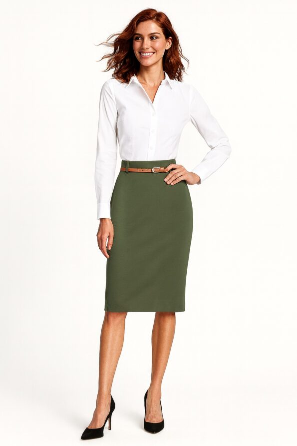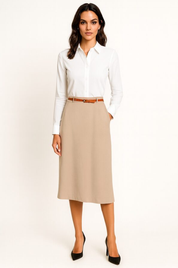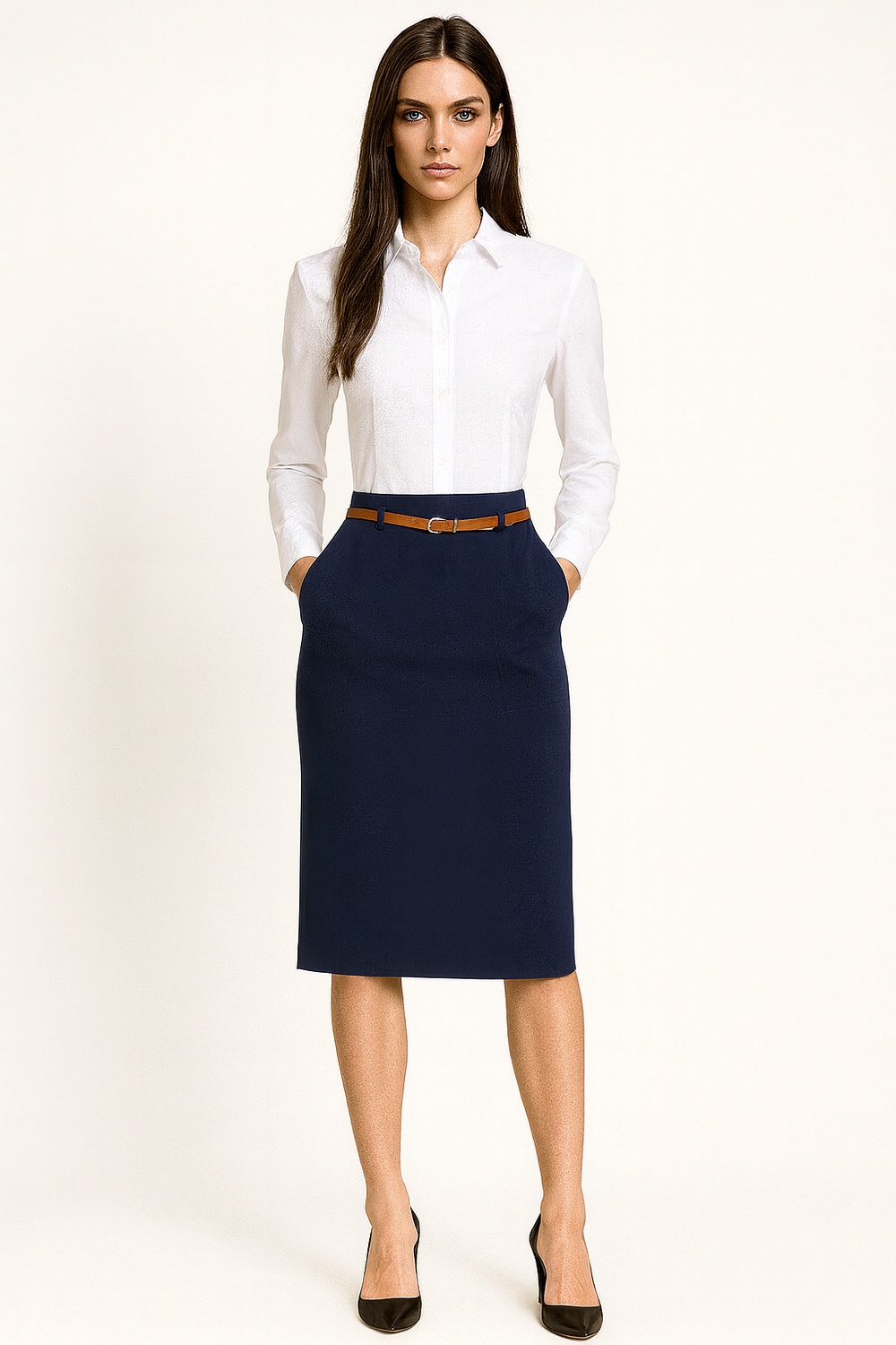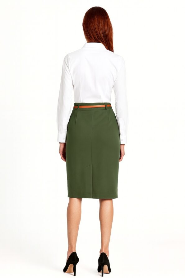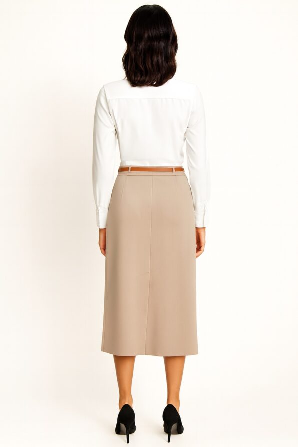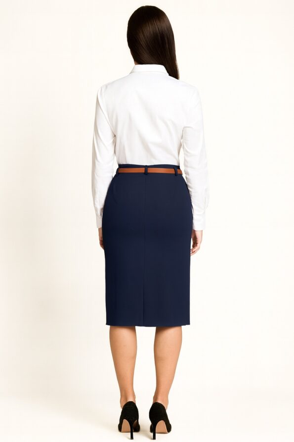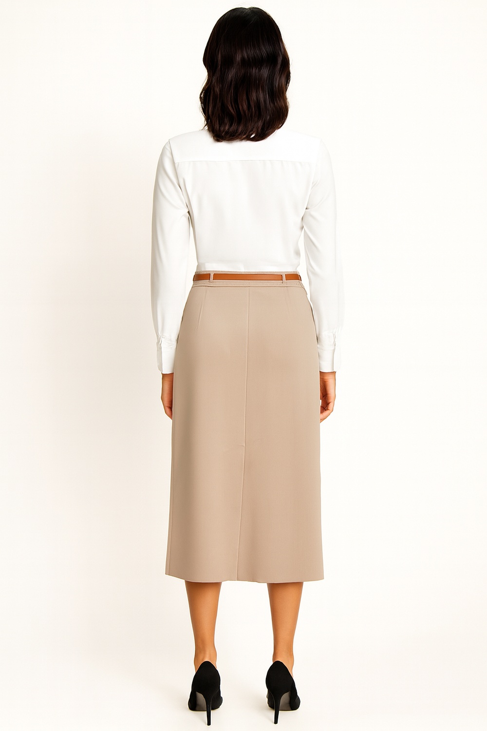 Falda de corte recto con pretina a la cintura que define la silueta, incluye cinturón desmontable con hebilla oval que aporta un toque moderno, largo por debajo de la rodilla que ofrece un estilo elegante y versátil, confección en tejido suave con caída estructurada que garantiza comodidad y ajuste natural al cuerpo, cierre posterior invisible que proporciona acabado limpio