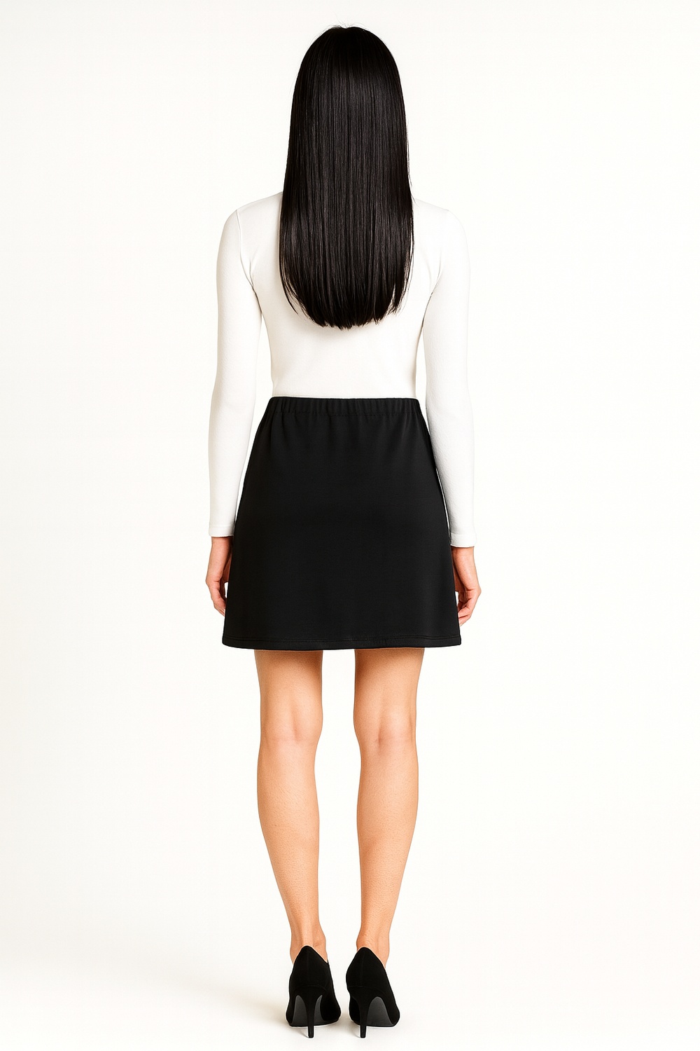 Minifalda de corte recto con pretina ancha que proporciona ajuste seguro, detalles decorativos de moños al frente que añaden un toque femenino y delicado, abertura lateral que facilita el movimiento, confección en tejido elástico de textura suave que se adapta al cuerpo y mantiene su forma, acabado limpio en dobladillos para un aspecto pulido y moderno