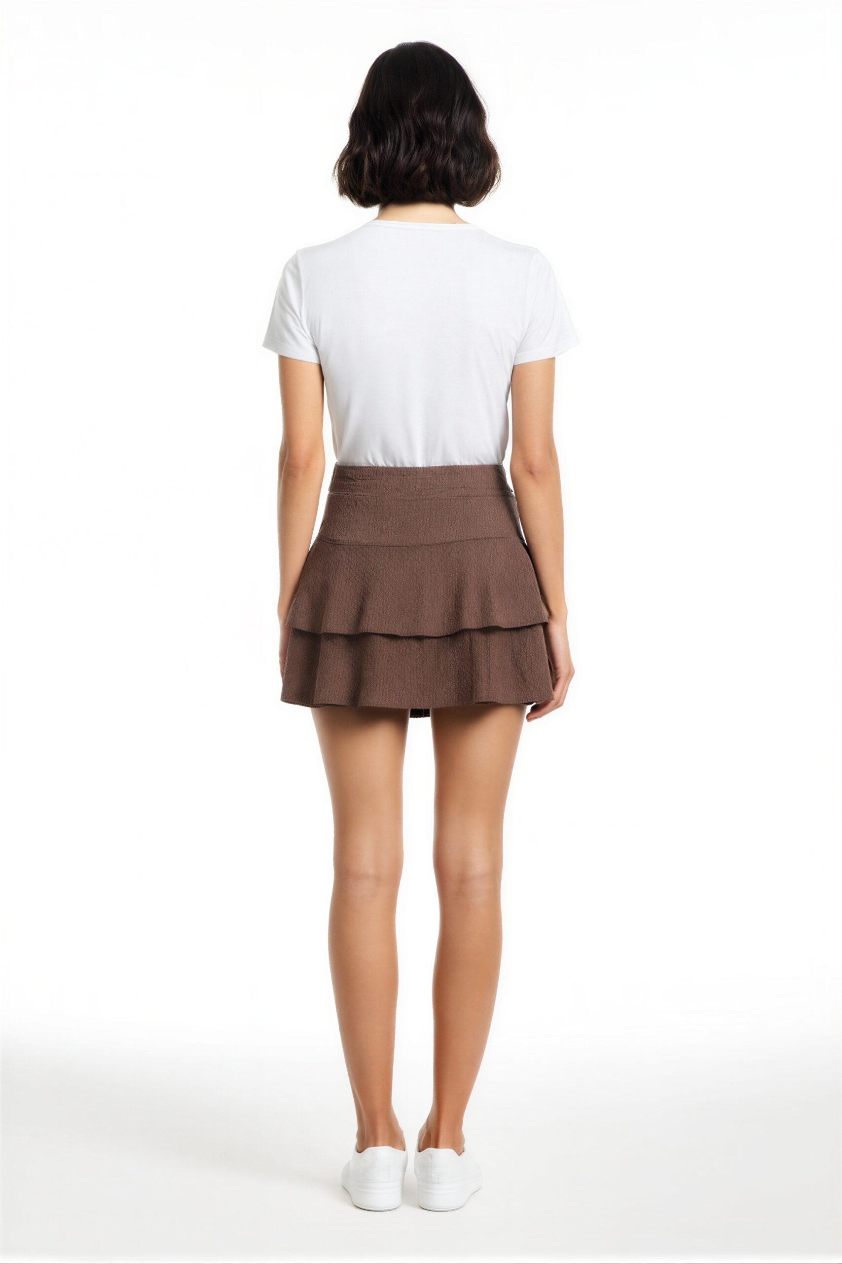 Minifalda de tiro alto con pretina ancha que brinda ajuste firme en la cintura, diseño de tres niveles con olanes que aportan volumen equilibrado, largo corto que realza la proporción de la silueta, confección en tejido suave con movimiento natural, acabado inferior con caída uniforme