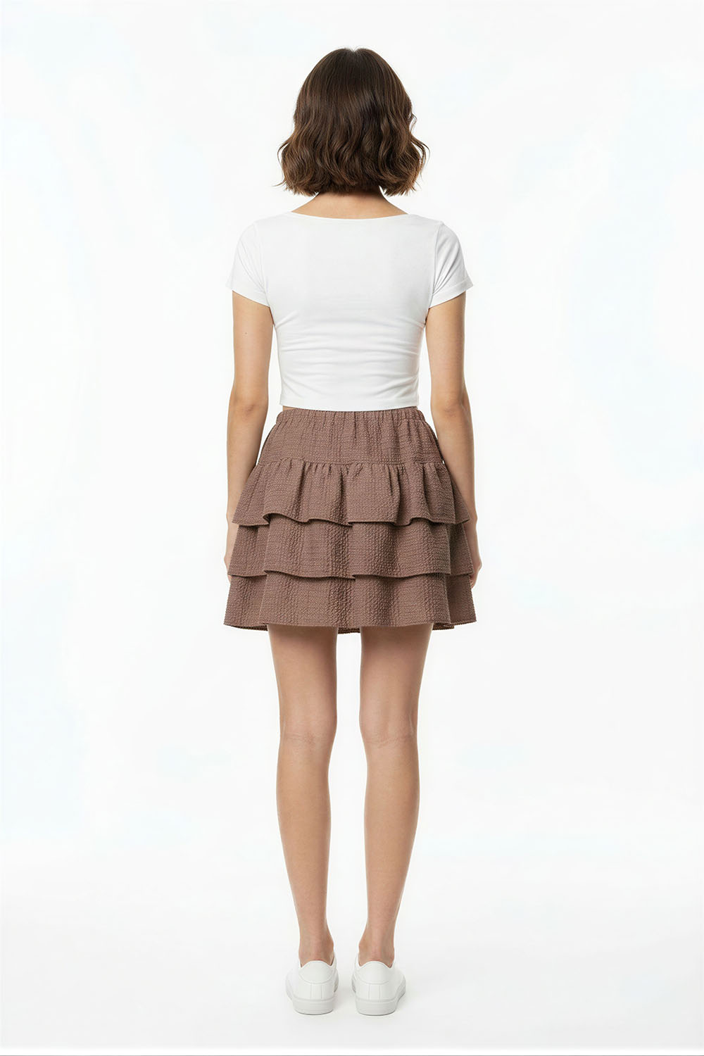 Minifalda con pretina amplia, diseño de capas con olanes, textura ligera, caída suave, terminación ondulada